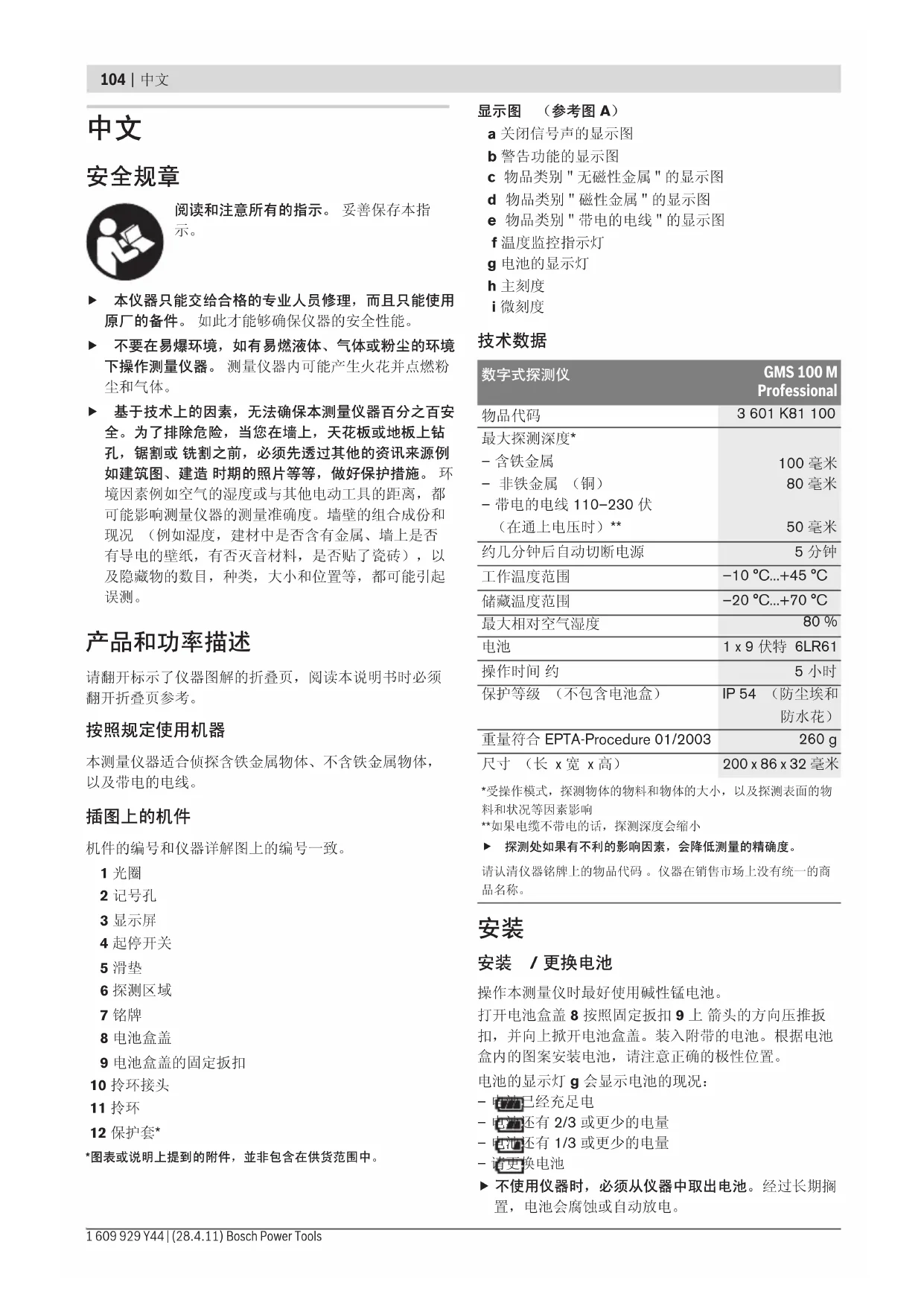 機件的編號和儀器詳解圖上的編號一致。 1 光圈 2 記號孔 3 顯示屏 4 起停開關 5 滑墊 6 探測範圍 7 銘牌 8 電池盒蓋 9 電池盒蓋的固定扳扣 10 拎環接頭 11 拎環 12 保護套* *插圖中或說明書中提到的附件,并不包含在正常的供貨範圍中。 顯示圖 (參考圖 A) a 關閉信號聲的顯示圖 b 警告功能的顯示圖 c 物品類別 " 無磁性金屬 " 的顯示圖 d 物品類別 " 磁性金屬 " 的顯示圖 e 物品類別 " 帶電的電線 " 的顯示圖 f 溫度監控指示燈 g 電池的顯示燈 h 主刻度 i 微刻度