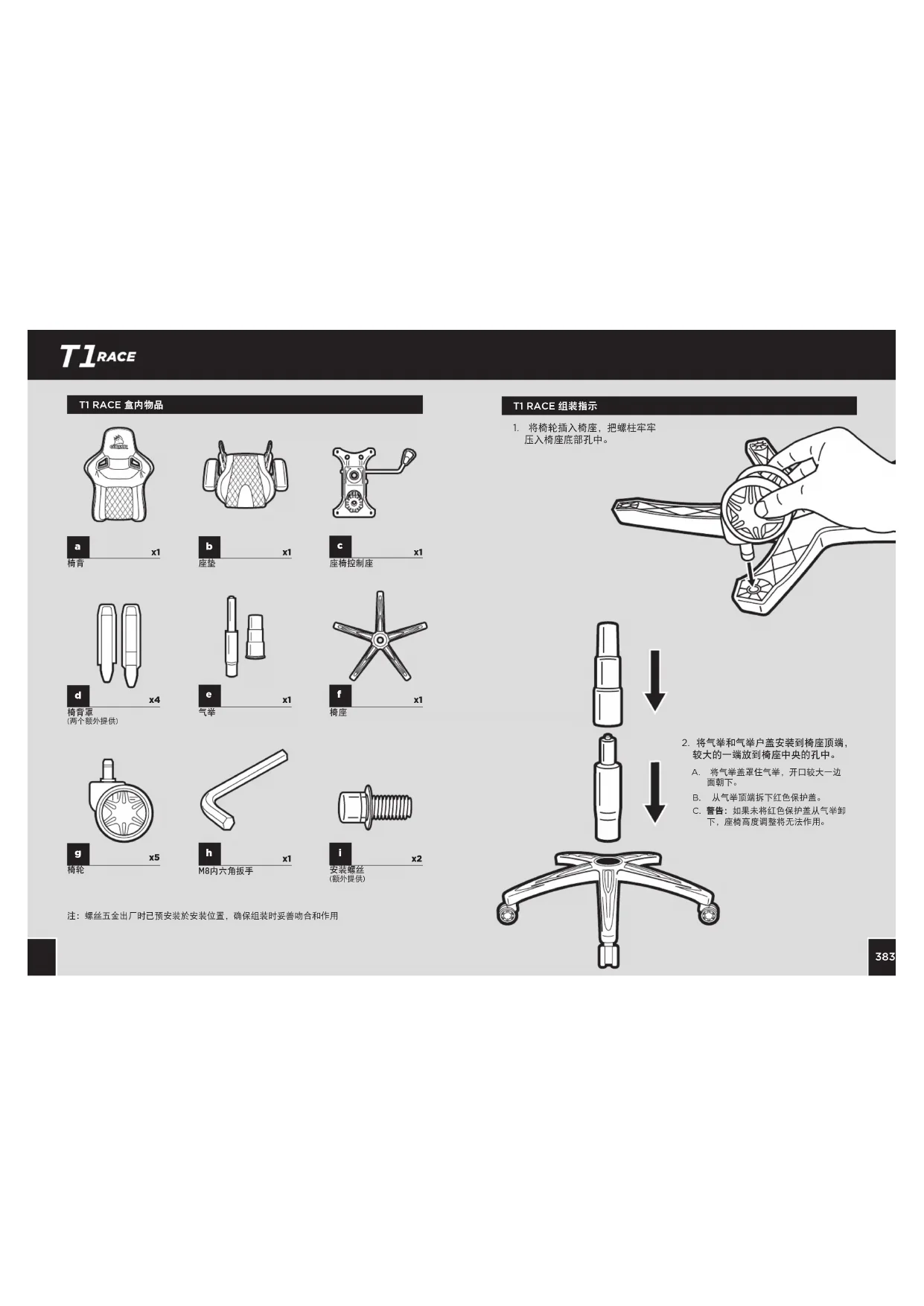 B. 从气举顶端拆下红色保护盖。 C. 警告:如果未将红色保护盖从气举卸 下,座椅高度调整将无法作用。 T1 RACE 组装指示4039 4039