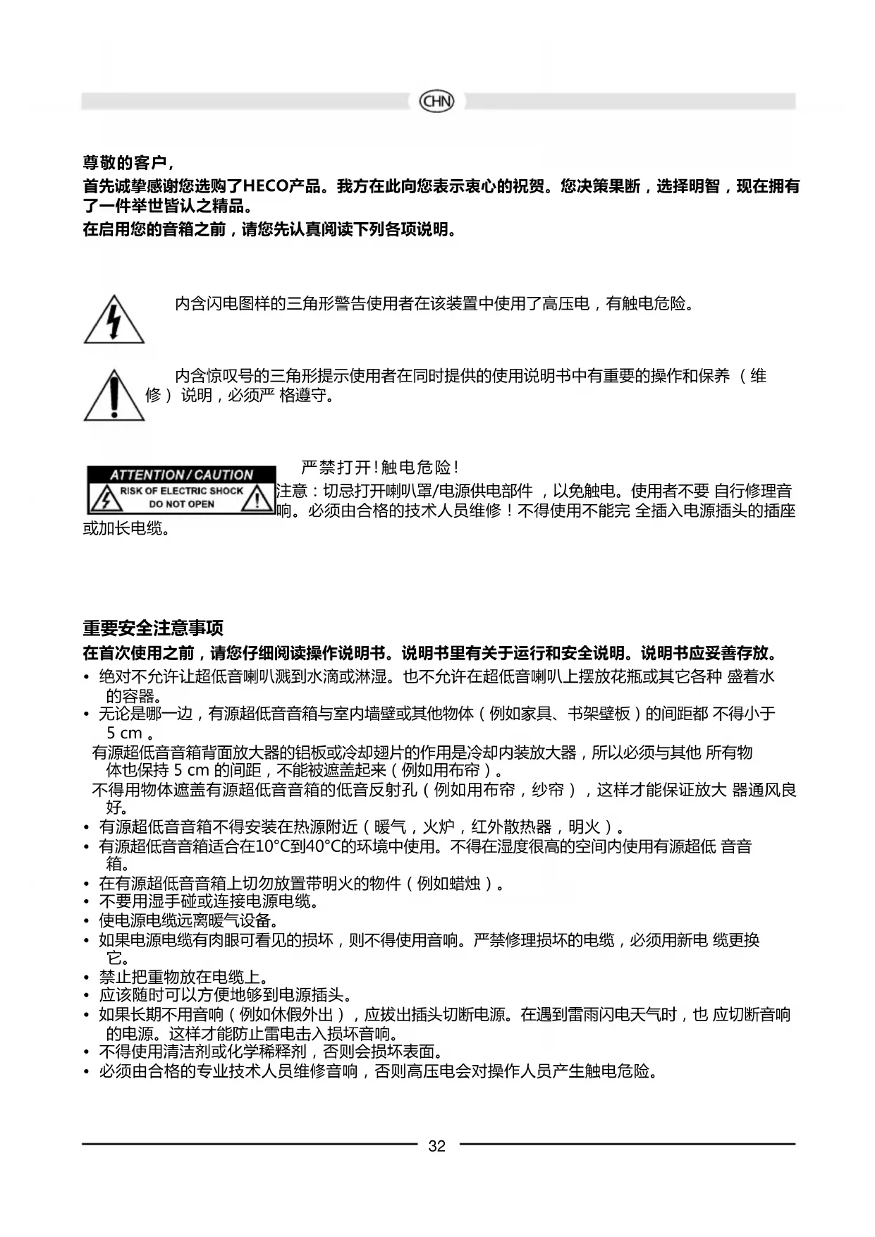 首先诚挚感谢您选购了HECO产品。我方在此向您表示衷心的祝贺。您决策果断,选择明智,现在拥有 了一件举世皆认之精品。 在启用您的音箱之前,请您先认真阅读下列各项说明。 内含闪电图样的三角形警告使用者在该装置中使用了高压电,有触电危险。 内含惊叹号的三角形提示使用者在同时提供的使用说明书中有重要的操作和保养 (维 修) 说明,必须严 格遵守。 严 禁 打 开!触 电 危 险! 注意:切忌打开喇叭罩/电源供电部件 ,以免触电。使用者不要 自行修理音 响。必须由合格的技术人员维修!不得使用不能完 全插入电源插头的插座