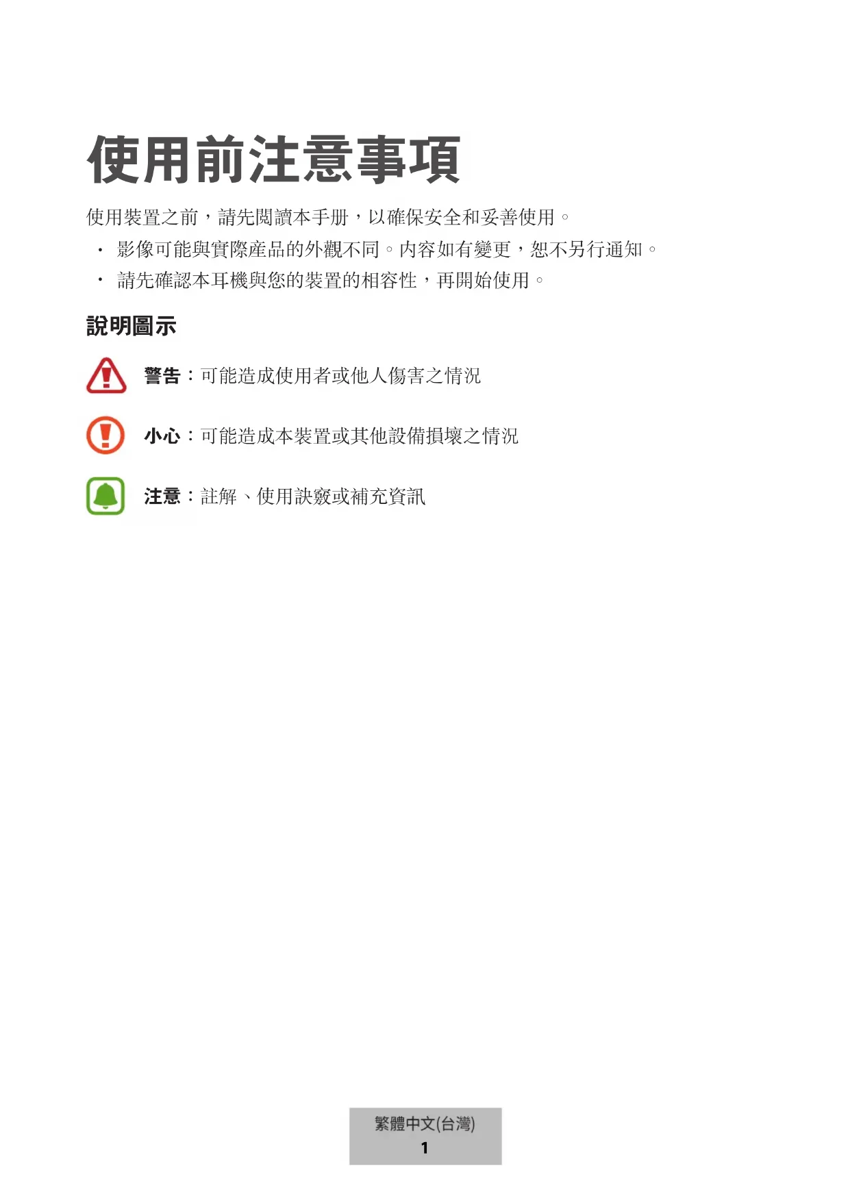 第一次使用耳機前或長時間未使用耳機後,請先為電池充電。 僅能使用三星核可的充電器。未經核可的充電器,可能導致耳機爆炸或毀損