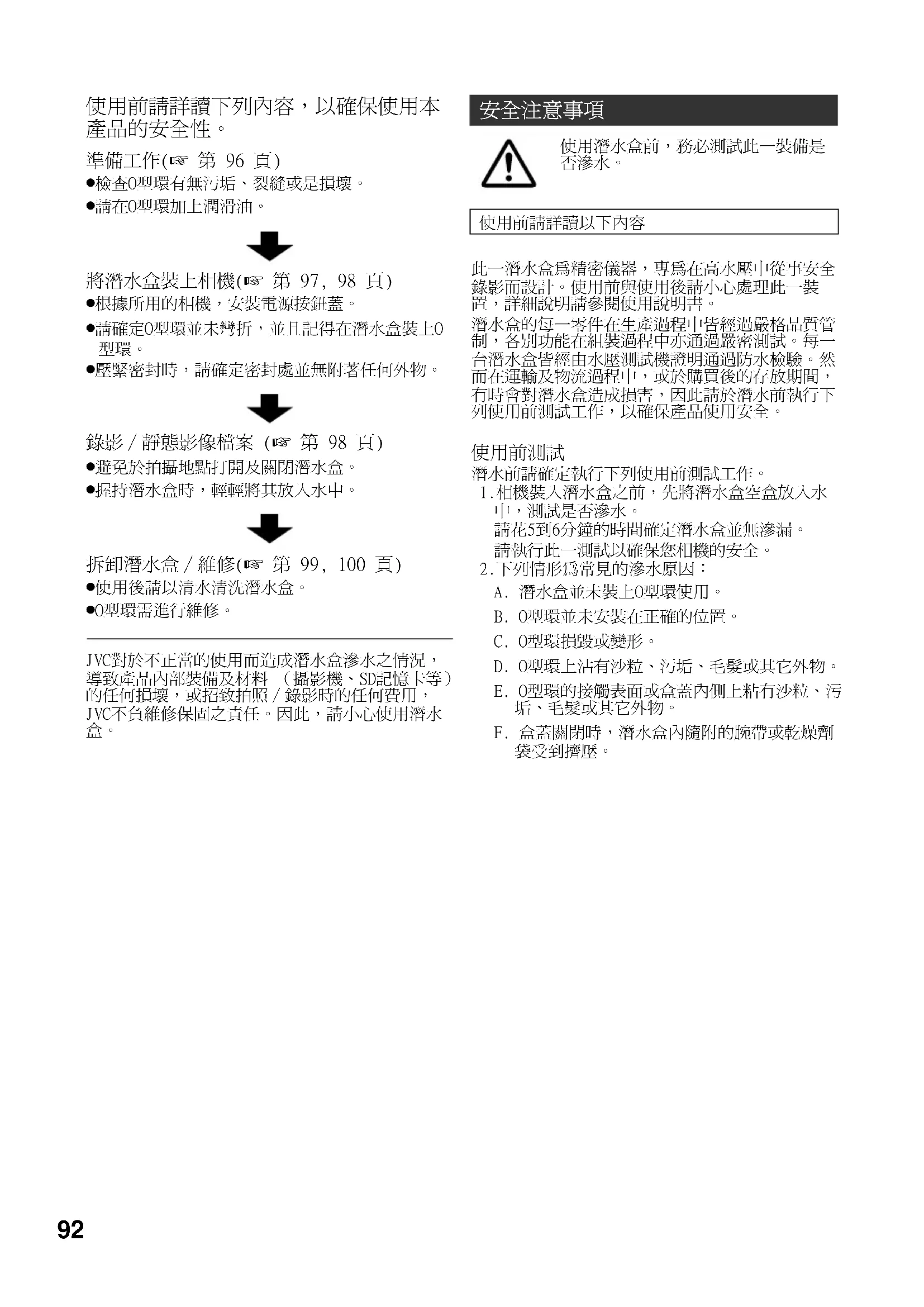 ● 壓緊密封時,請確定密封處並無附著任何外物。 錄影∕靜態影像檔案 (A 第 98 頁) ● 避免於拍攝地點打開及關閉潛水盒。 ● 握持潛水盒時,輕輕將其放入水中。 拆卸潛水盒∕維修(A 第 99, 100 頁) ● 使用後請以清水清洗潛水盒。 ● O型環需進行維修。 JVC對於不正當的使用而造成潛水盒滲水之情況, 導致產品內部裝備及材料 (攝影機、SD記憶卡等) 的任何損壞,或招致拍照∕錄影時的任何費用, JVC不負維修保固之責任。因此,請小心使用潛水