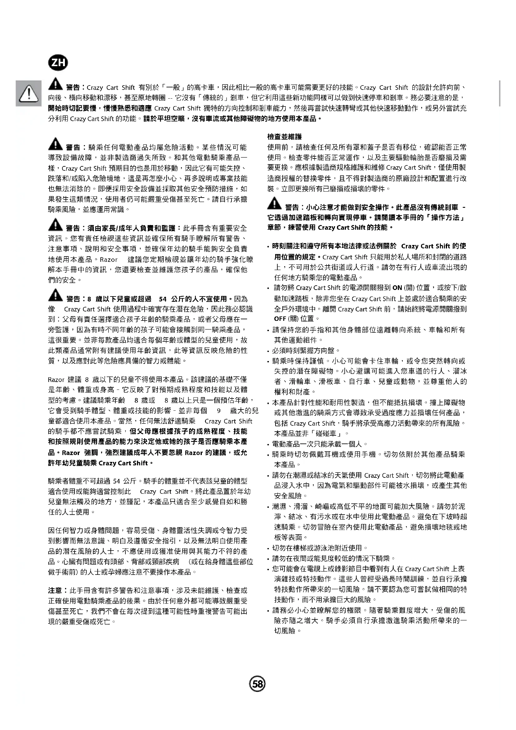 警告︰8 歲以下兒童或超過 54 公斤的人不宜使用。因為 像 Crazy Cart Shift 使用過程中確實存在潛在危險,因此務必認識 到︰父母有責任選擇適合孩子年齡的騎乘產品,或者父母應在一 旁監護,因為有時不同年齡的孩子可能會接觸到同一騎乘產品, 這很重要。並非每款產品均適合每個年齡或體型的兒童使用,故 此類產品通常附有建議使用年齡資訊,此等資訊反映危險的性 質,以及應對此等危險應具備的智力或體能。 Razor 建議 8 歲以下的兒童不得使用本產品。該建議的基礎不僅 是年齡、體重或身高–它反映了對預期成熟程度和技能以及體 型的考慮。建議騎乘年齡 8 歲或 8 歲以上只是一個預估年齡, 它會受到騎手體型、體重或技能的影響–並非每個 9 歲大的兒 童都適合使用本產品。當然,任何無法舒適騎乘 Crazy Cart Shift 的騎手都不應嘗試騎乘,但父母應根據孩子的成熟程度、技能 和按照規則使用產品的能力來決定他或她的孩子是否應騎乘本產 品。Razor 強調,強烈建議成年人不要忽視 Razor 的建議,或允 許年幼兒童騎乘 Crazy Cart Shift。 騎乘者體重不可超過 54 公斤。騎手的體重並不代表該兒童的體型 適合使用或能夠適當控制此 Crazy Cart Shift。將此產品置於年幼 兒童無法觸及的地方,並謹記,本產品只適合至少感覺自如和勝