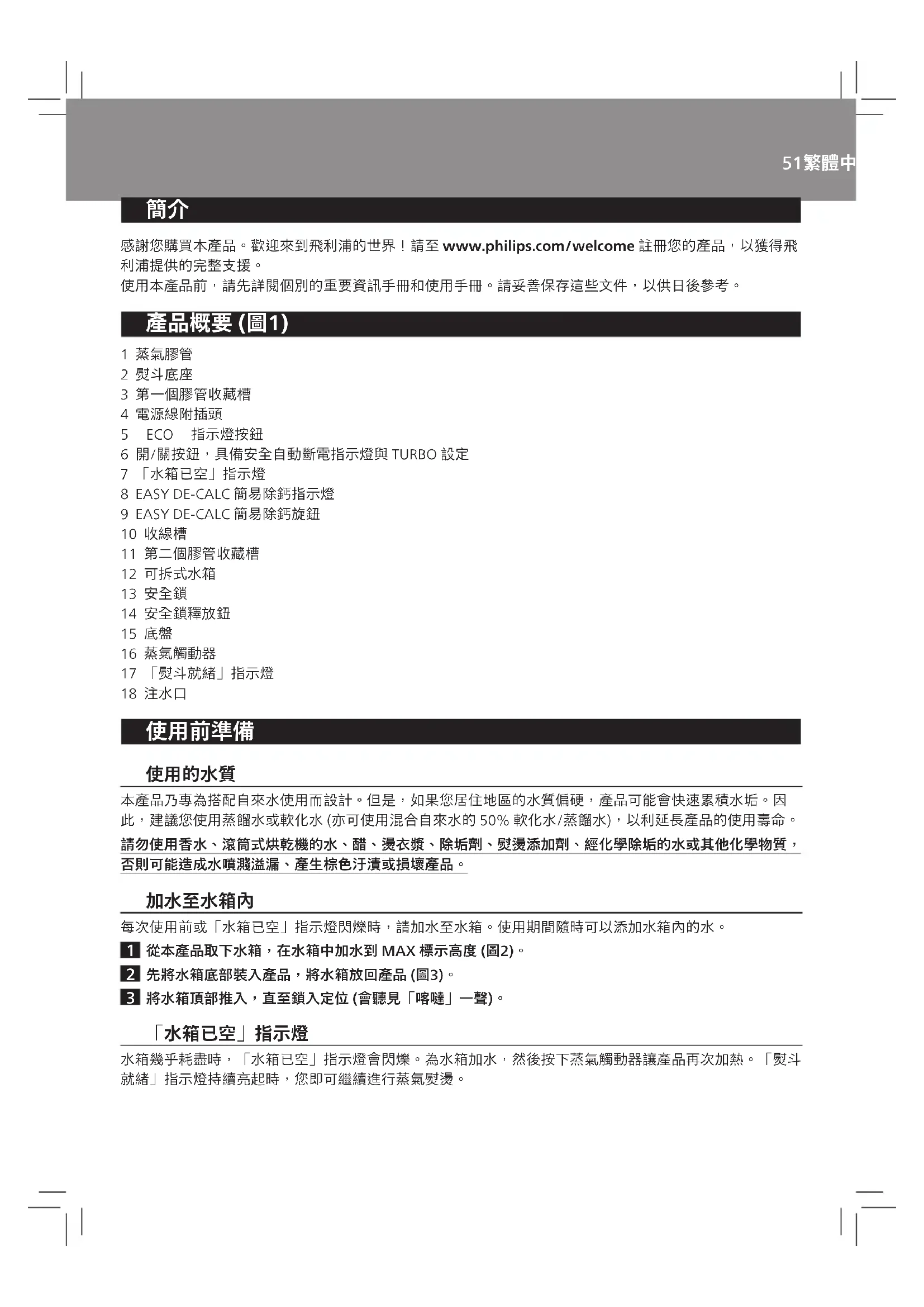 使用本產品前,請先詳閱個別的重要資訊手冊和使用手冊。請妥善保存這些文件,以供日後參考。 產品概要 (圖1) 1 蒸氣膠管 2 熨斗底座 3 第一個膠管收藏槽 4 電源線附插頭 5 ECO 指示燈按鈕 6 開/關按鈕,具備安全自動斷電指示燈與 TURBO 設定 7 「水箱已空」指示燈 8 EASY DE-CALC 簡易除鈣指示燈 9 EASY DE-CALC 簡易除鈣旋鈕 10 收線槽 11 第二個膠管收藏槽 12 可拆式水箱 13 安全鎖 14 安全鎖釋放鈕 15 底盤 16 蒸氣觸動器 17 「熨斗就緒」指示燈 18 注水口