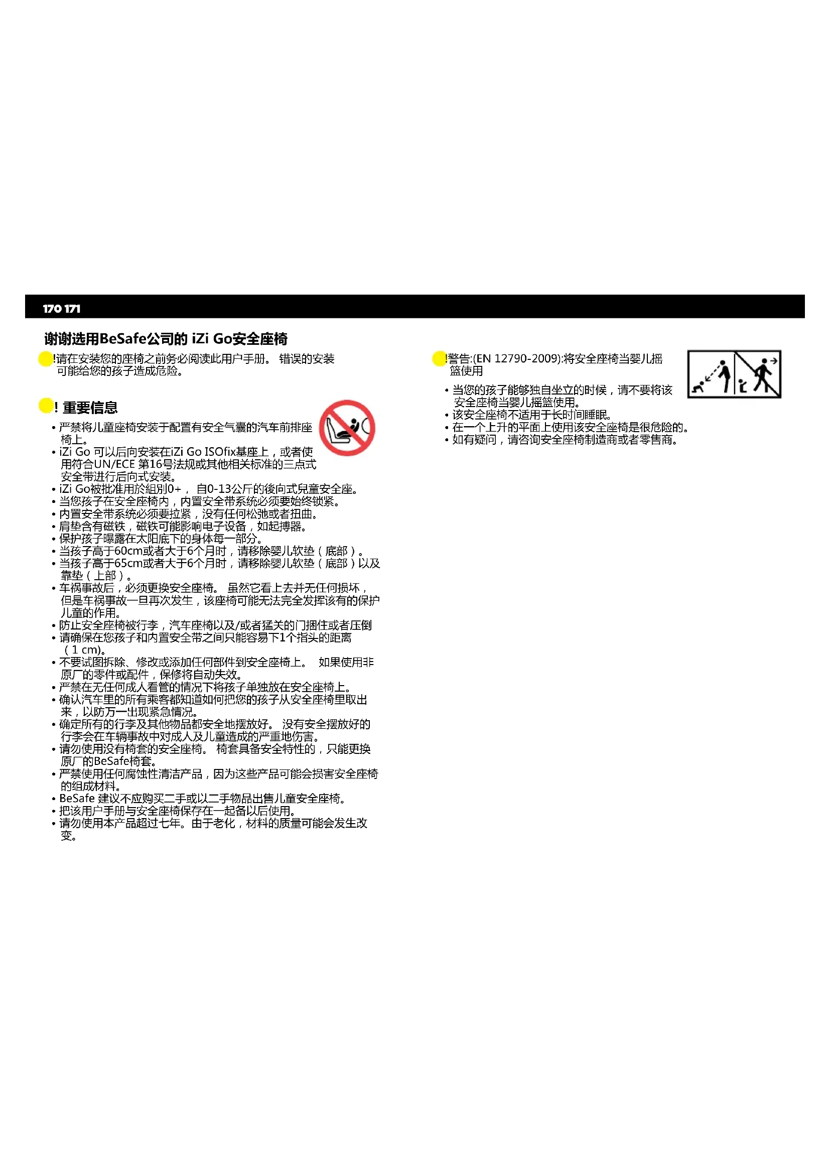 谢谢选用BeSafe公司的 iZi Go安全座椅 ! 请在安装您的座椅之前务必阅读此用户手册。错误的安装 可能给您的孩子造成危险。 ! 警告:(EN12790-2009):将安全座椅当婴儿摇