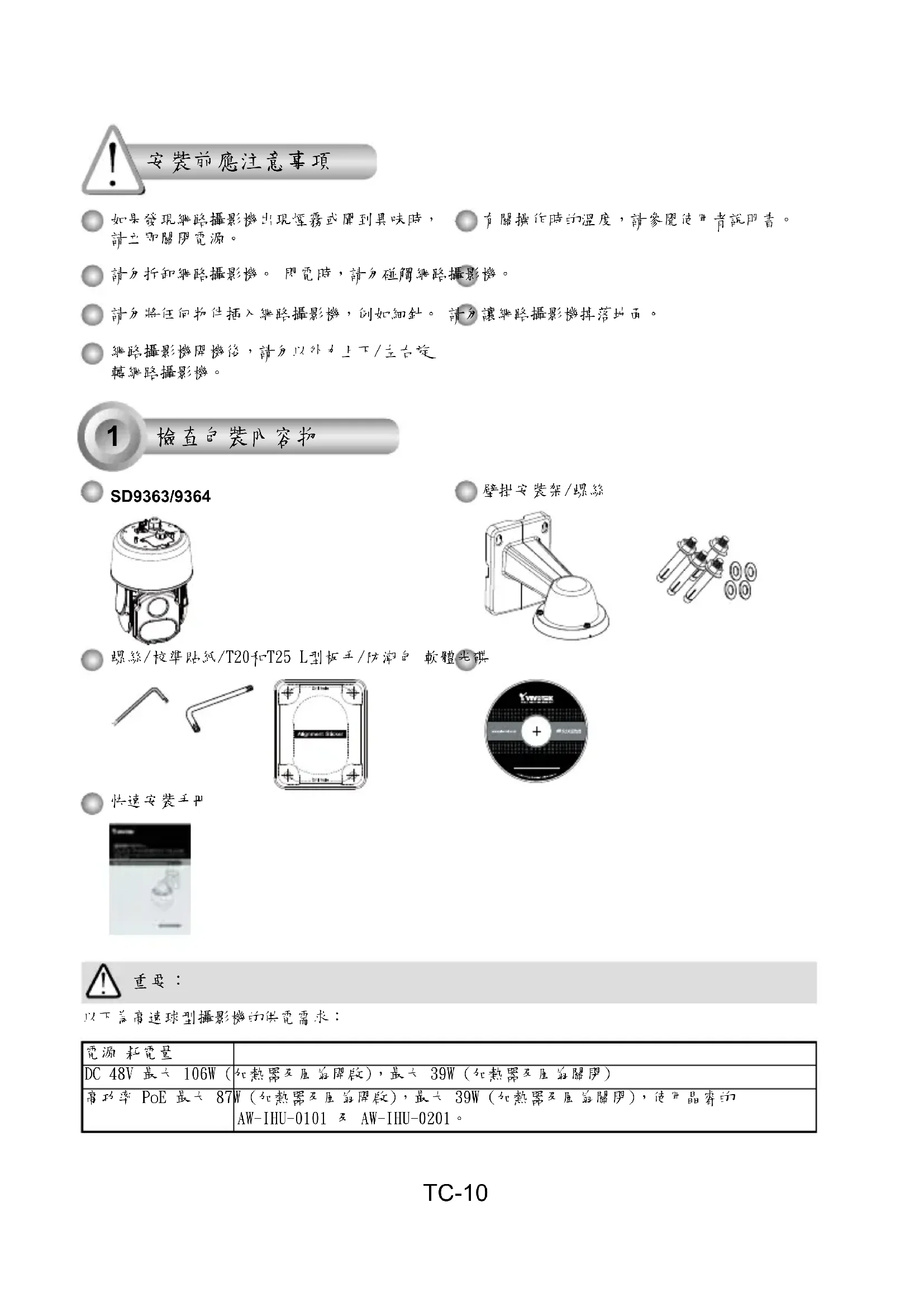 切勿使网络摄像头坠落。 切勿在通电时用手摇晃或旋转网络摄像头。 SD9363/9364