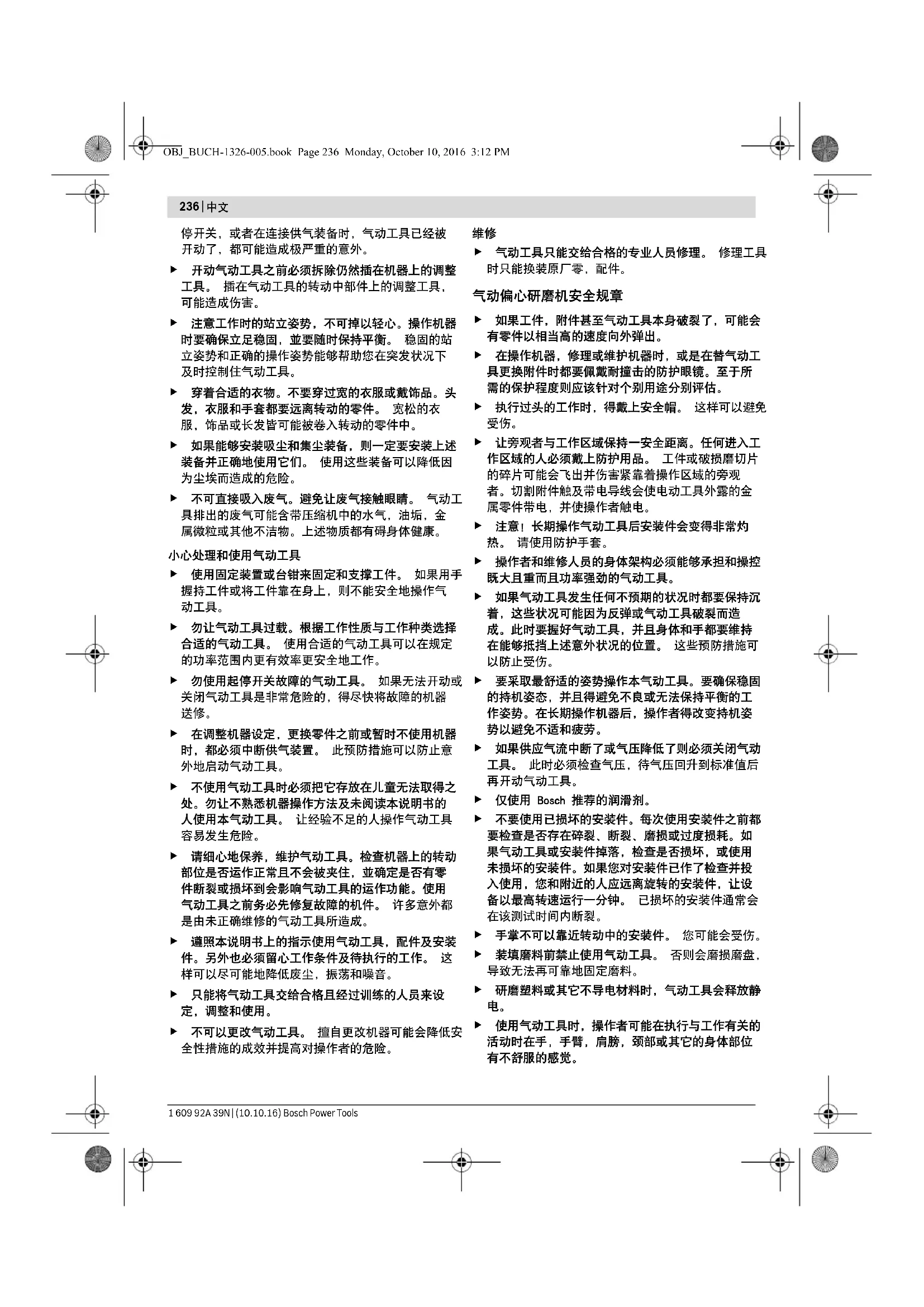 OBJ_BUCH-1326-005.book Page 235 Monday, October 10, 2016 3:12 PM236 | 中文 1 609 92A 39N | (10.10.16) Bosch Power Tools 停开关,或者在连接供气装备时,气动工具已经被 开动了,都可能造成极严重的意外。 开动气动工具之前必须拆除仍然插在机器上的调整 工具。 插在气动工具的转动中部件上的调整工具,