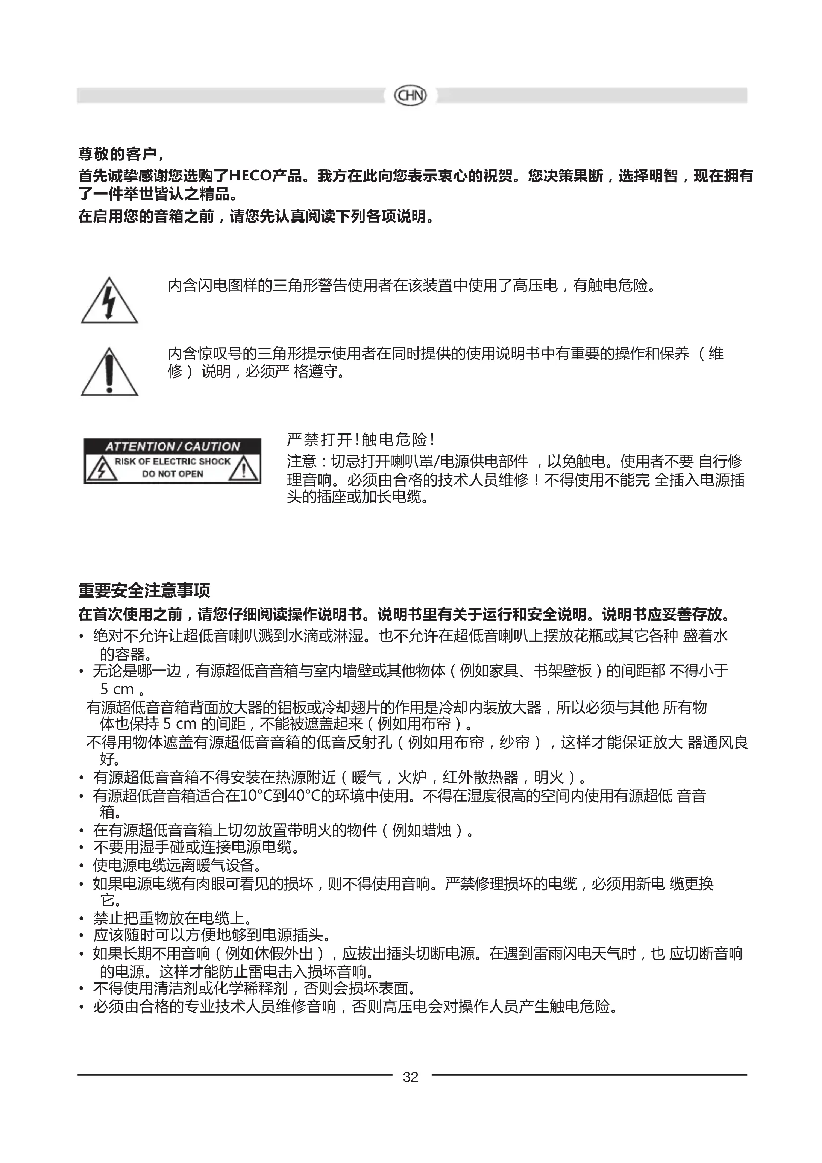 首先诚挚感谢您选购了HECO产品。我方在此向您表示衷心的祝贺。您决策果断,选择明智,现在拥有 了一件举世皆认之精品。 在启用您的音箱之前,请您先认真阅读下列各项说明。 内含闪电图样的三角形警告使用者在该装置中使用了高压电,有触电危险。 内含惊叹号的三角形提示使用者在同时提供的使用说明书中有重要的操作和保养 (维 修) 说明,必须严 格遵守。 严 禁 打 开!触 电 危 险! 注意:切忌打开喇叭罩/电源供电部件 ,以免触电。使用者不要 自行修 理音响。必须由合格的技术人员维修!不得使用不能完 全插入电源插