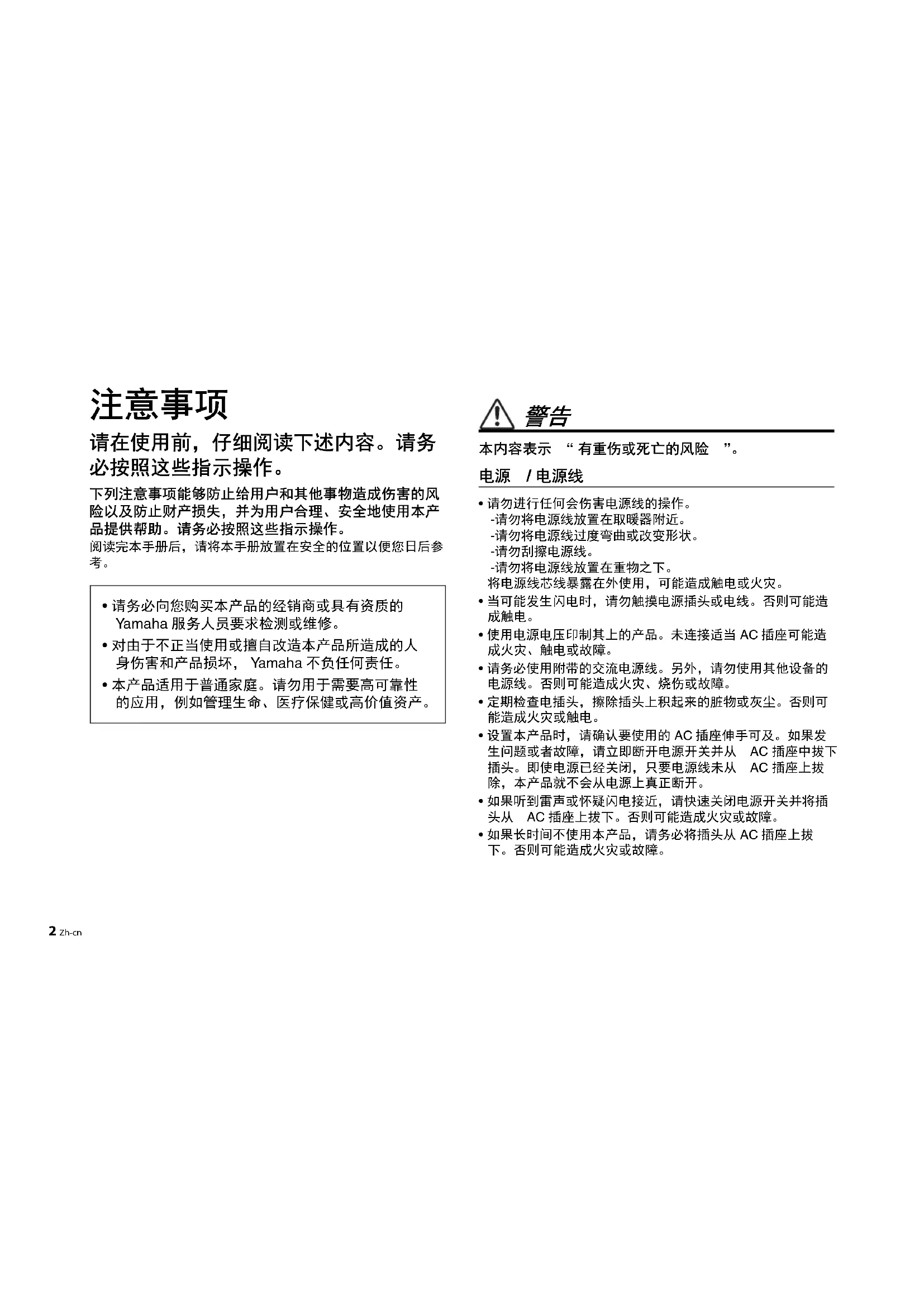 - 如果长时间不使用本产品,请务必将插头从 AC 插座上拔 下。否则可能造成火灾或故障。• 请务必向您购买本产品的经销商或具有资质的 Ya m a h a 服务人员要求检测或维修。