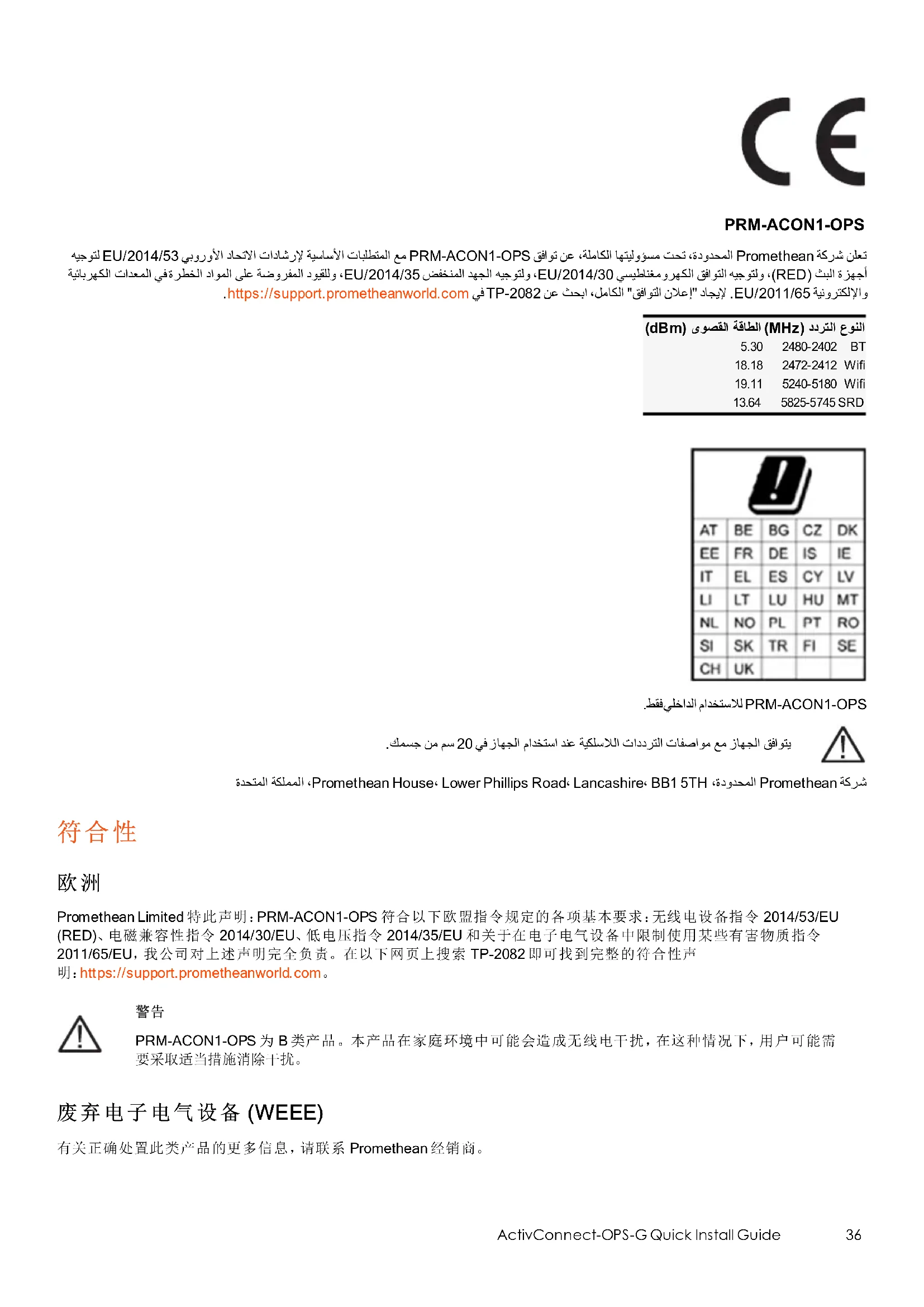 Promethean Limited 聲明獨立負責 PRM-ACON1-OPS 符合歐盟指令:2014/53/EU 無線電設備指令 (RED)、2014/30/EU 電磁 37 ActivConnect-OPS-G Quick Install Guide兼容性指令、2014/35/EU 低電壓指令及 2011/65/EU 電機電子產品中有害物質禁限用指令。完整的符合性聲明可於此網頁 搜尋「TP-2082」即可找到相關資訊:https://support.prometheanworld.com。