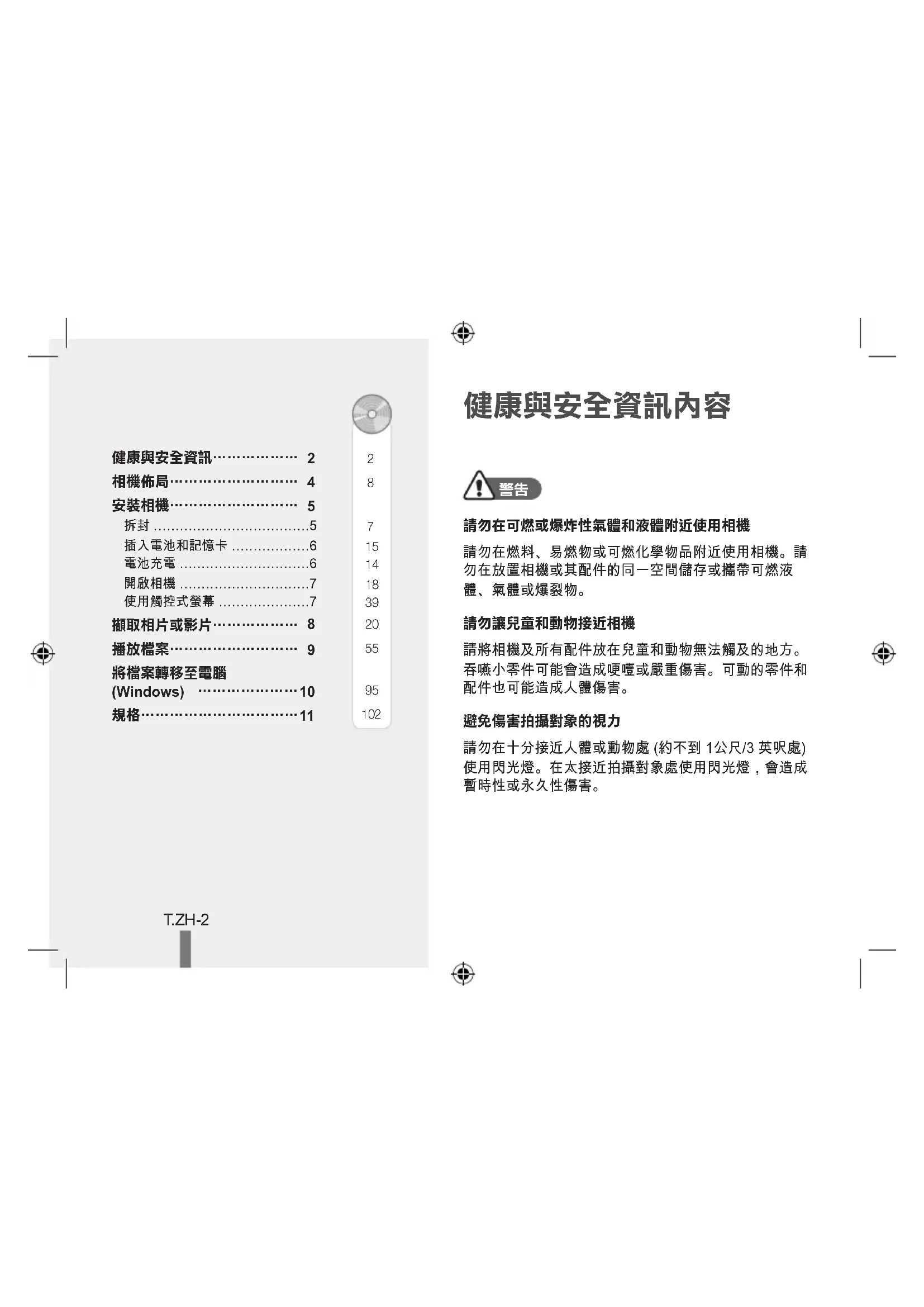 小心處理與處置電池和充電器 僅使用 Samsung 核准的電池和充電器。不相容的 電池和充電器會嚴重傷害或損壞相機。 切勿將電池或相機放在加熱裝置上或放入其中, 例如微波爐、瓦斯爐或電熱器。電池過熱時可能