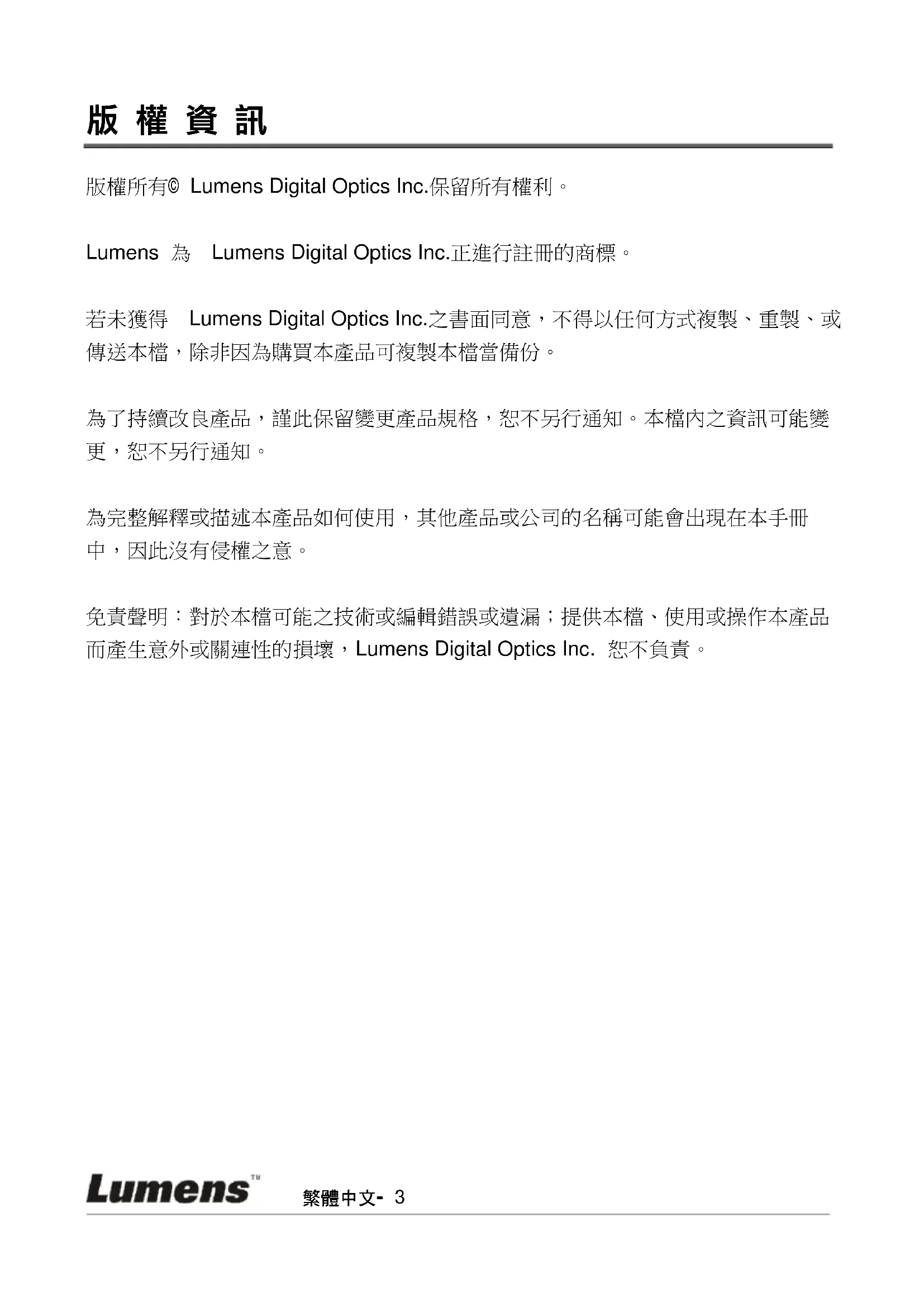 若未獲得 Lumens Digital Optics Inc.之書面同意,不得以任何方式複製、重製、或傳送本檔,除非因為購買本產品可複製本檔當備份。