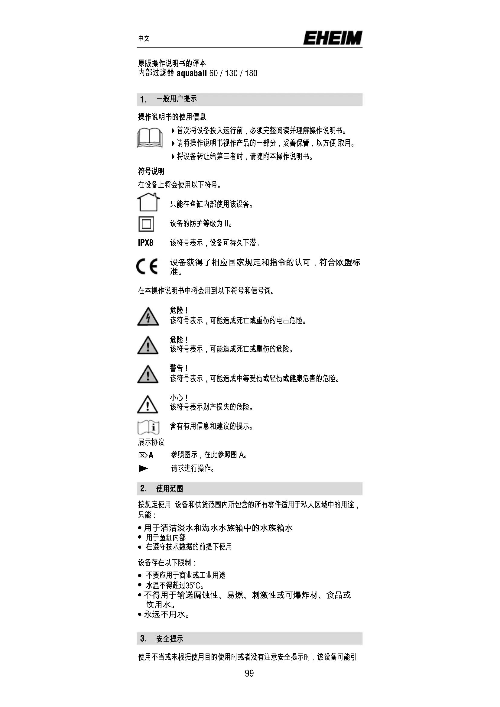 在设备上将会使用以下符号。 只能在鱼缸内部使用该设备。 设备的防护等级为 II。 IPX8 该符号表示,设备可持久下潜。 设备获得了相应国家规定和指令的认可,符合欧盟标