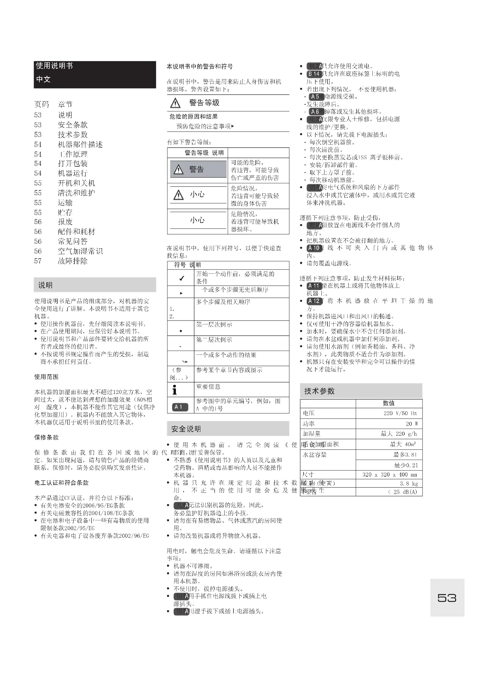 本机器的加湿面积最大不超过120立方米,空间过大,就不能达到理想的加湿效果(50%相对湿度),本机器不能作其它用途(仅供净化型加湿用)。机器内不能放入其它物体,本机器仅适用于说明书里的使用条款。