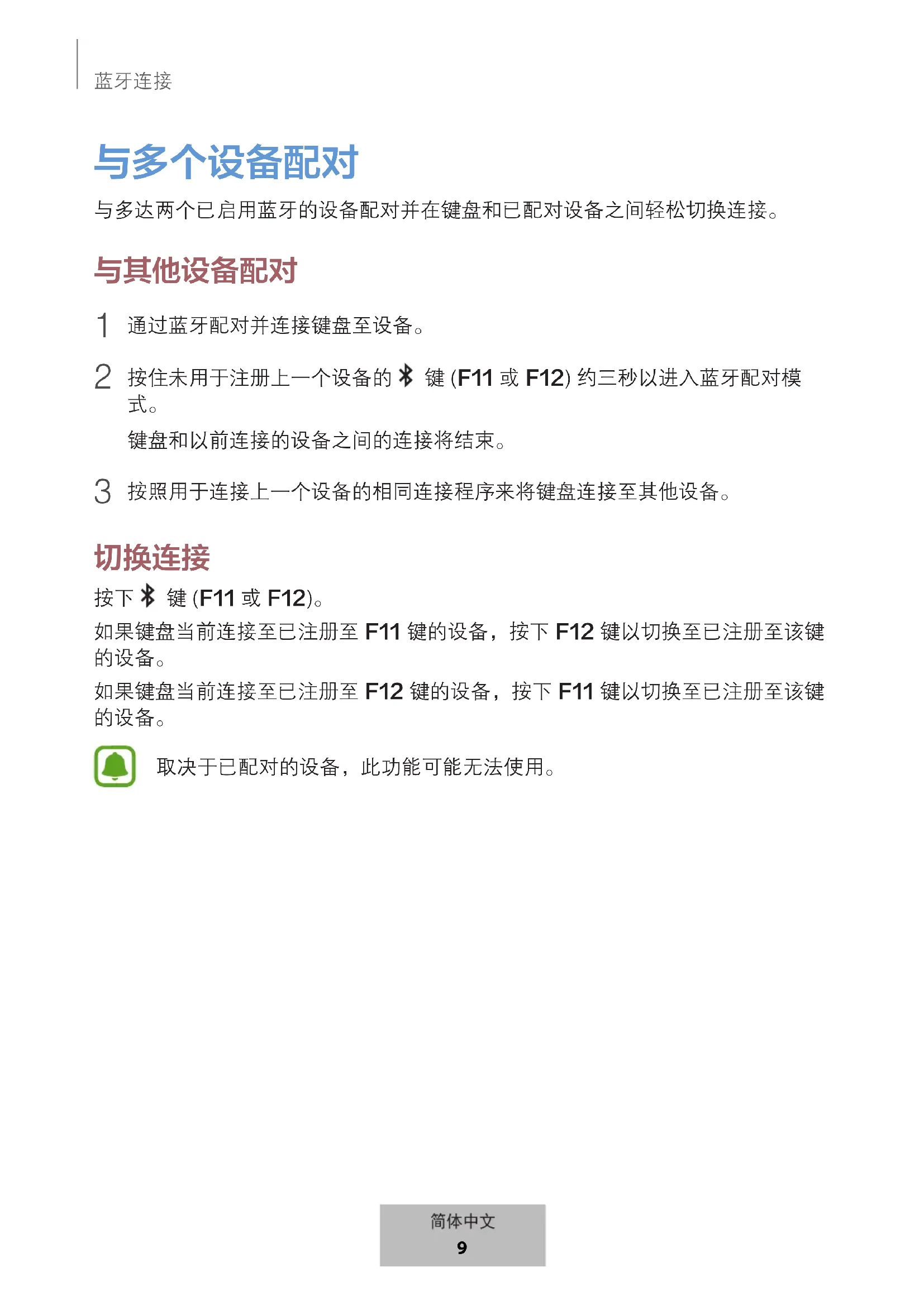 按住· ·键·(F11·或·F12)·约三秒钟。当前连接将结束且键盘将进入蓝牙配对模式。 也可以通过关闭键盘来结束连接。重新打开键盘且设备处于范围内时,键盘将会自 动与最近连接的设备连接。