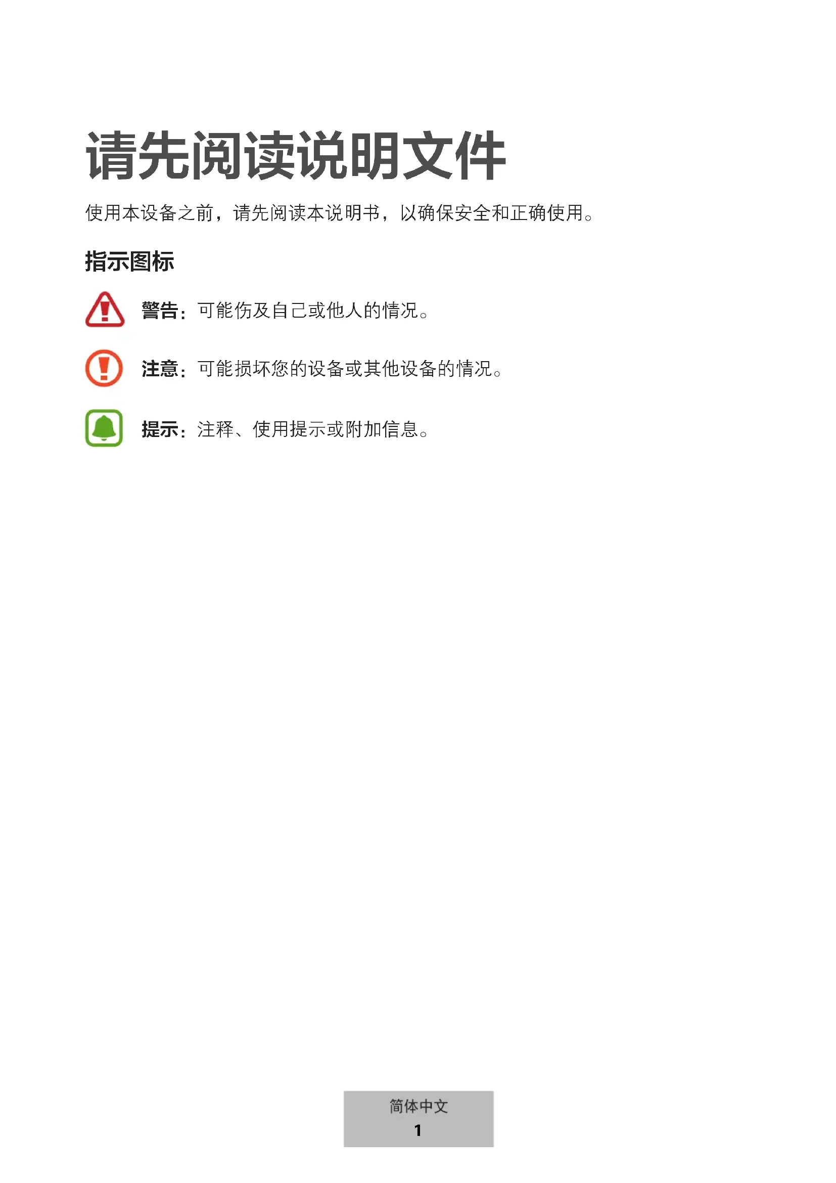 警告:可能伤及自己或他人的情况。 注意:可能损坏您的设备或其他设备的情况。 提示:注释、使用提示或附加信息。