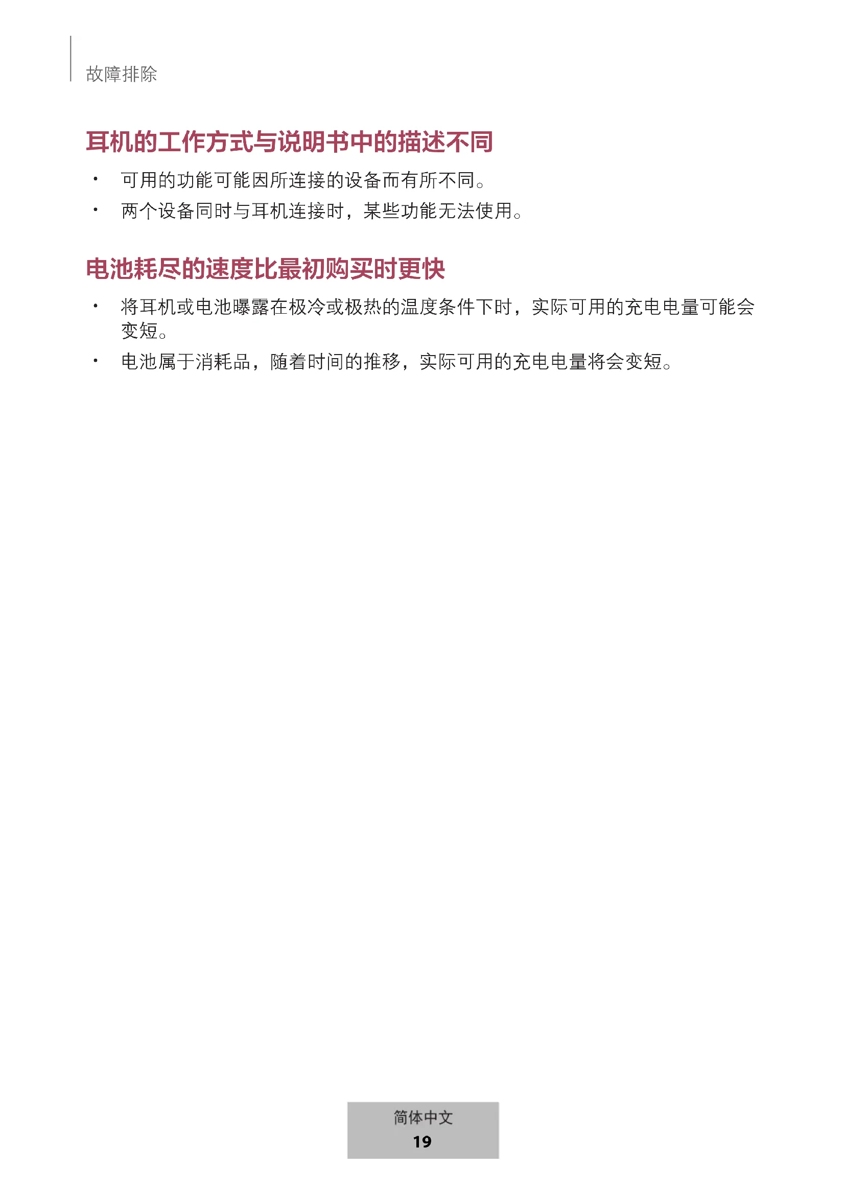 本耳機同時連接兩個裝置時,有些功能無法使用。 電池電力耗盡速度比購買時快