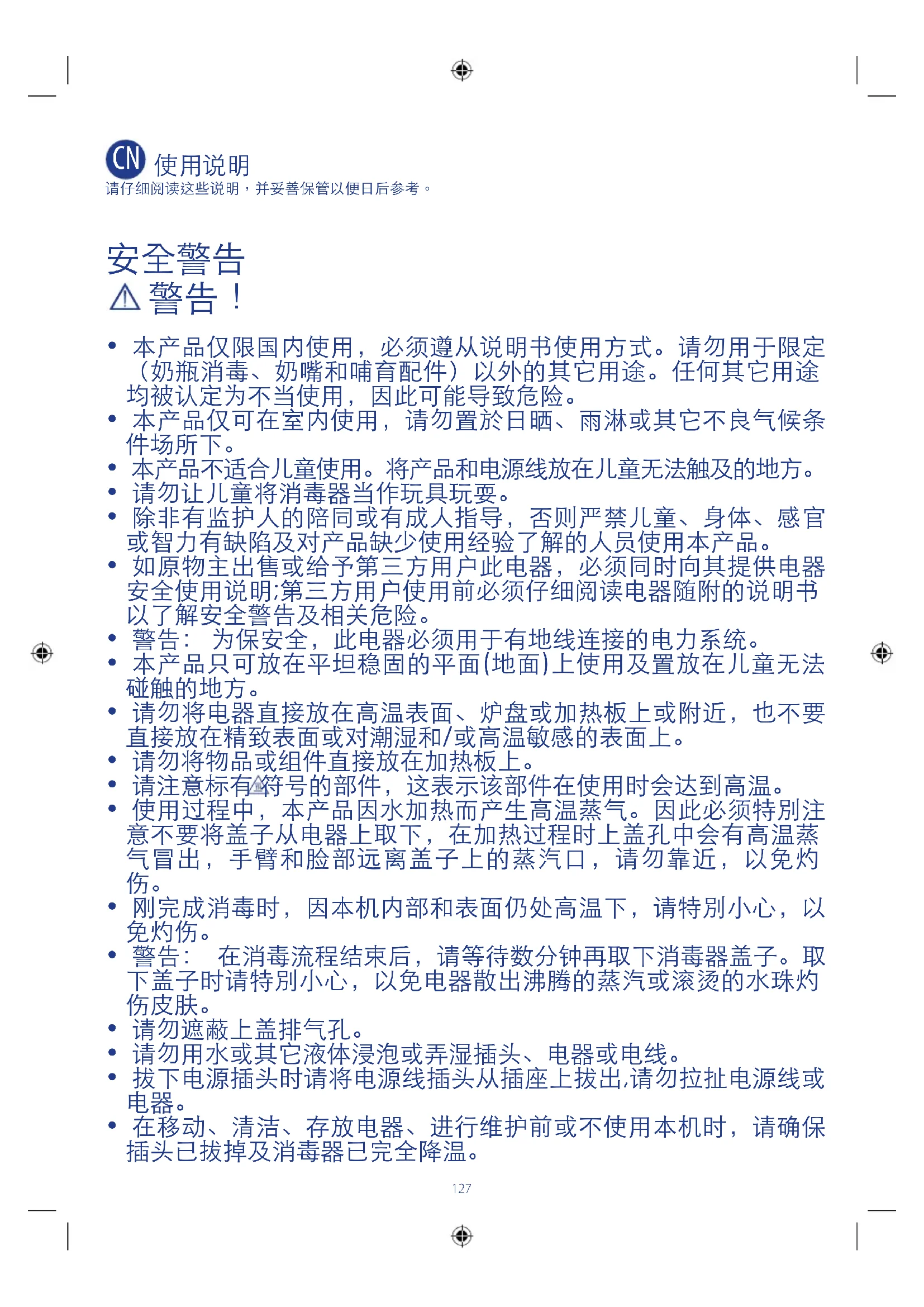 - 本产品仅限国内使用,必须遵从说明书使用方式。请勿用于限定 (奶瓶消毒、奶嘴和哺育配件)以外的其它用途。任何其它用途 均被认定为不当使用,因此可能导致危险。