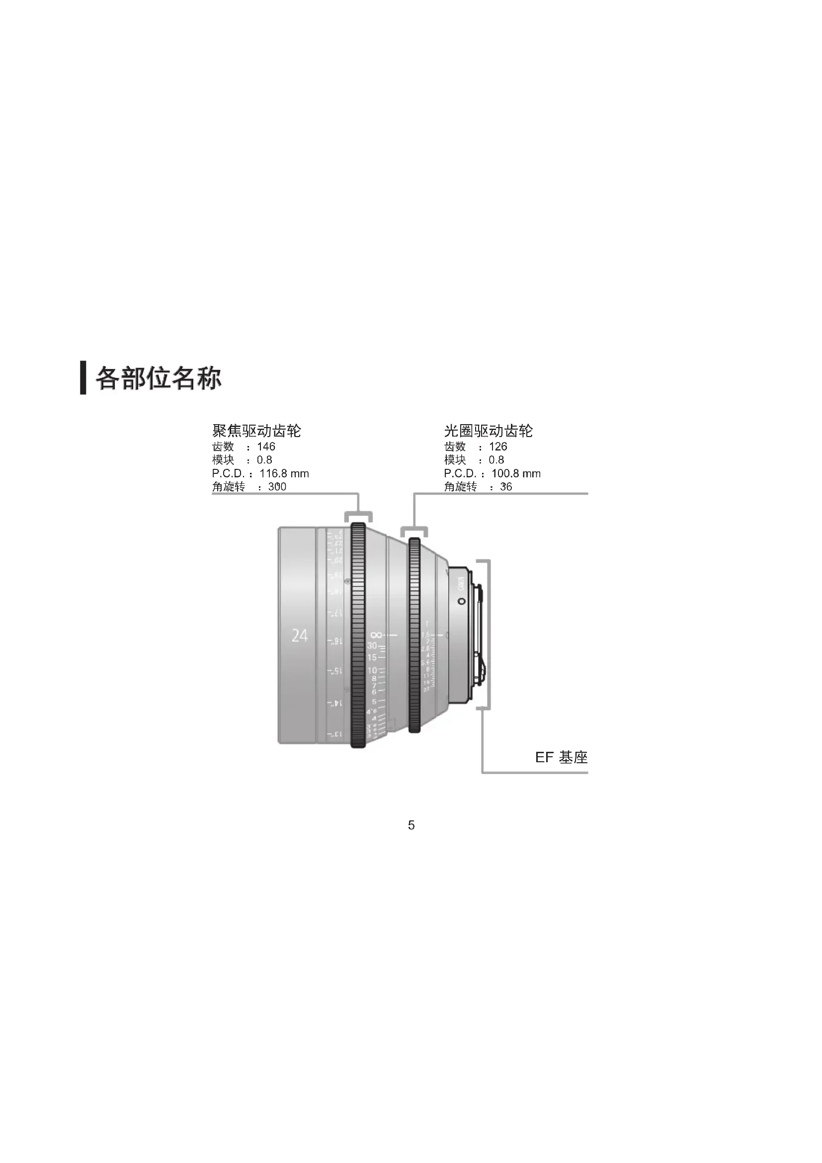 聚焦驱动齿轮 光圈驱动齿轮 齿数 146 126 模块 0.8 0.8 P.C.D. 116.8 mm 100.8 mm 角旋转 300 度 36 度 各部位尺寸10