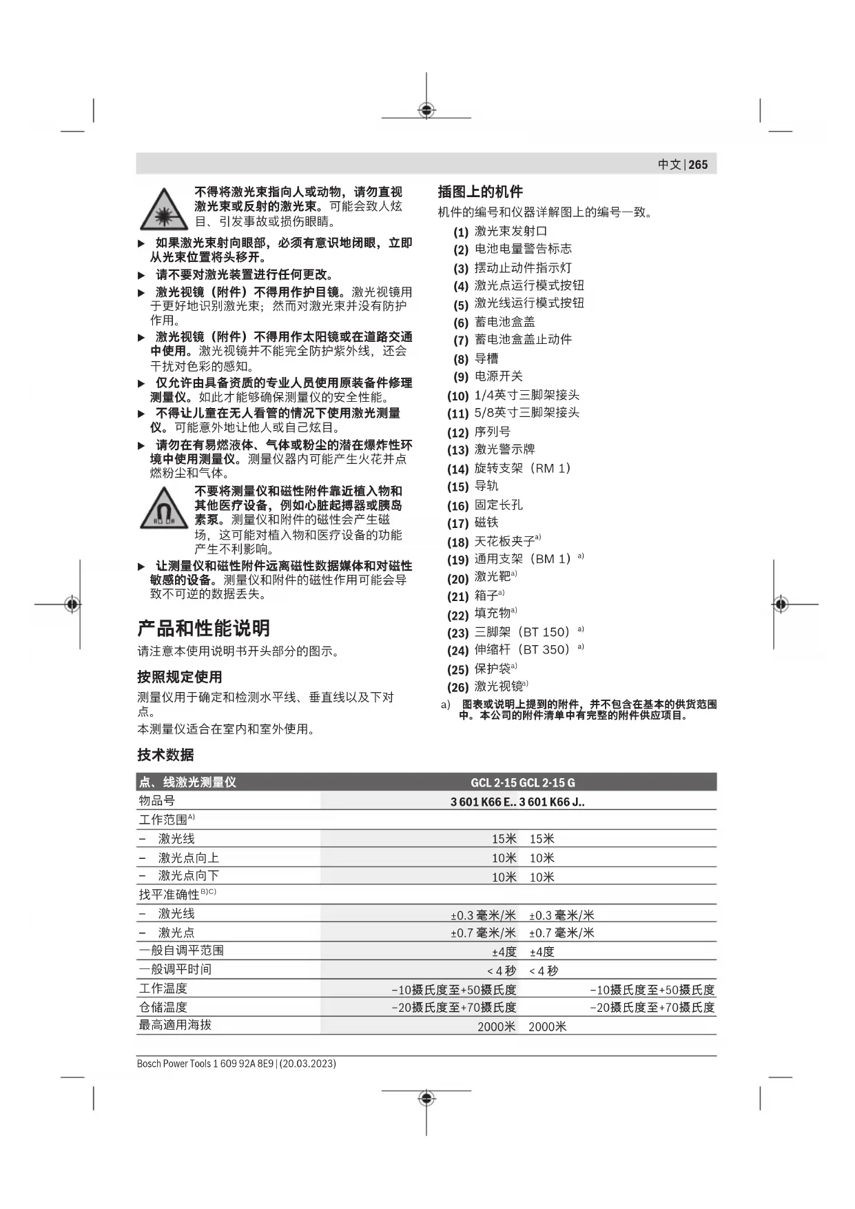 1 609 92A 8E9 | (20.03.2023) Bosch Power Tools中文 | 265 不得将激光束指向人或动物,请勿直视 激光束或反射的激光束。可能会致人炫 目、引发事故或损伤眼睛。 u 如果激光束射向眼部,必须有意识地闭眼,立即 u 请不要对激光装置进行任何更改。u 激光视镜(附件)不得用作护目镜。激光视镜用 于更好地识别激光束;然而对激光束并没有防护
