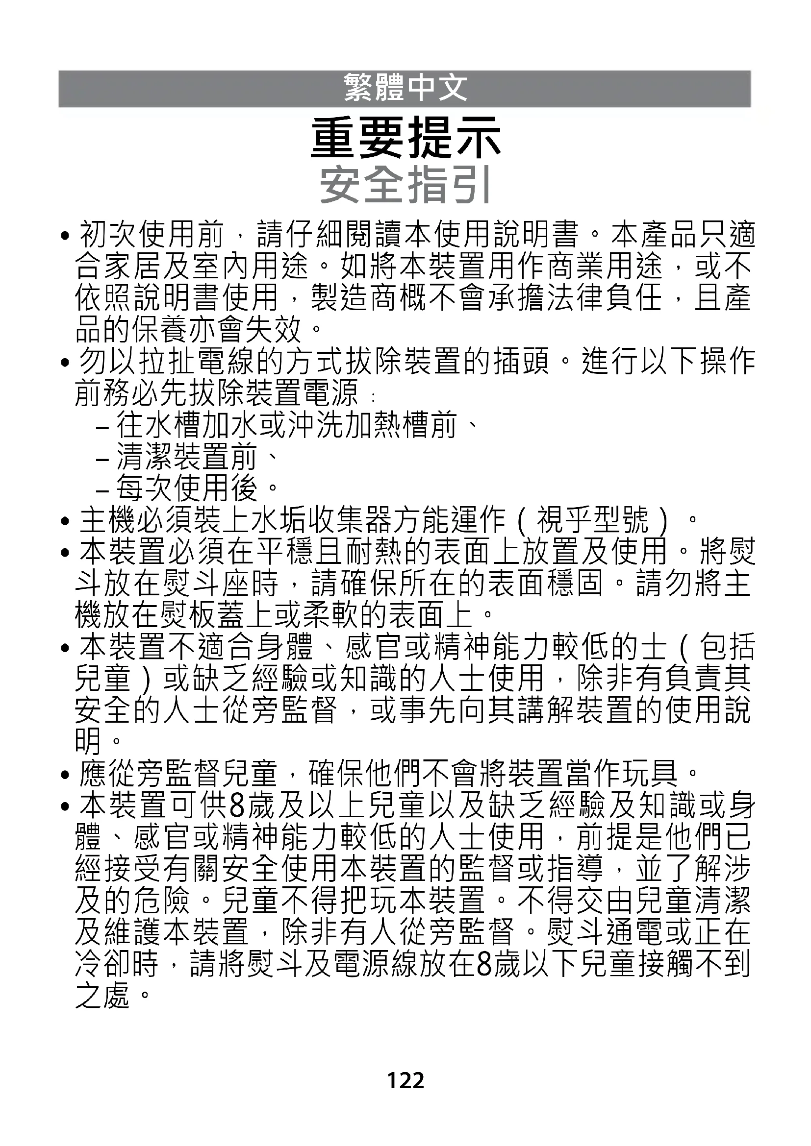 - 本裝置可供8歲及以上兒童以及缺乏經驗及知識或身 體、感官或精神能力較低的人士使用,前提是他們已 經接受有關安全使用本裝置的監督或指導,並了解涉 及的危險。兒童不得把玩本裝置。不得交由兒童清潔 及維護本裝置,除非有人從旁監督。熨斗通電或正在 冷卻時,請將熨斗及電源線放在8歲以下兒童接觸不到 之處。123