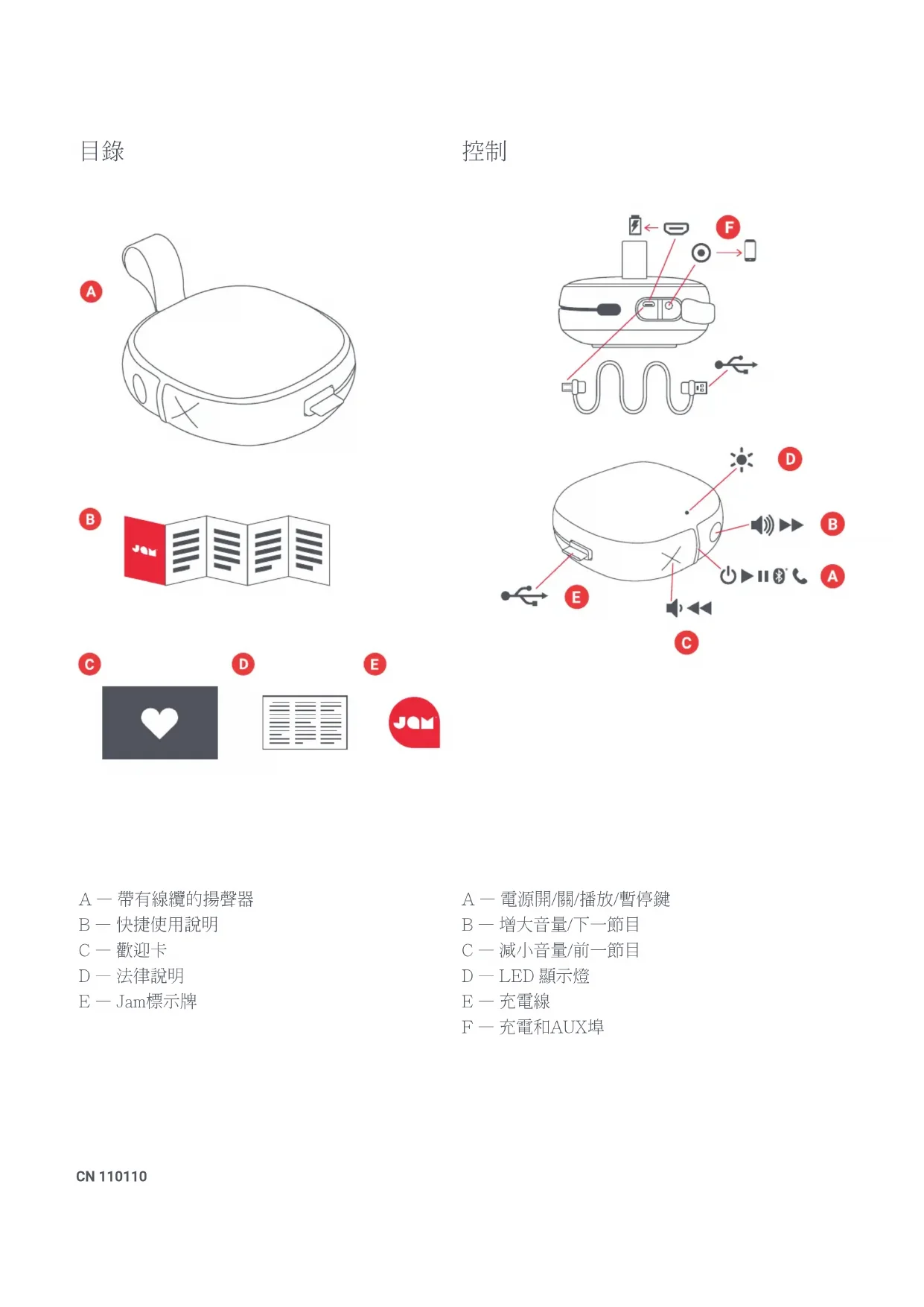 A – 帶有線纜的揚聲器 B – 快捷使用說明 C – 歡迎卡 D – 法律說明 E – Jam標示牌