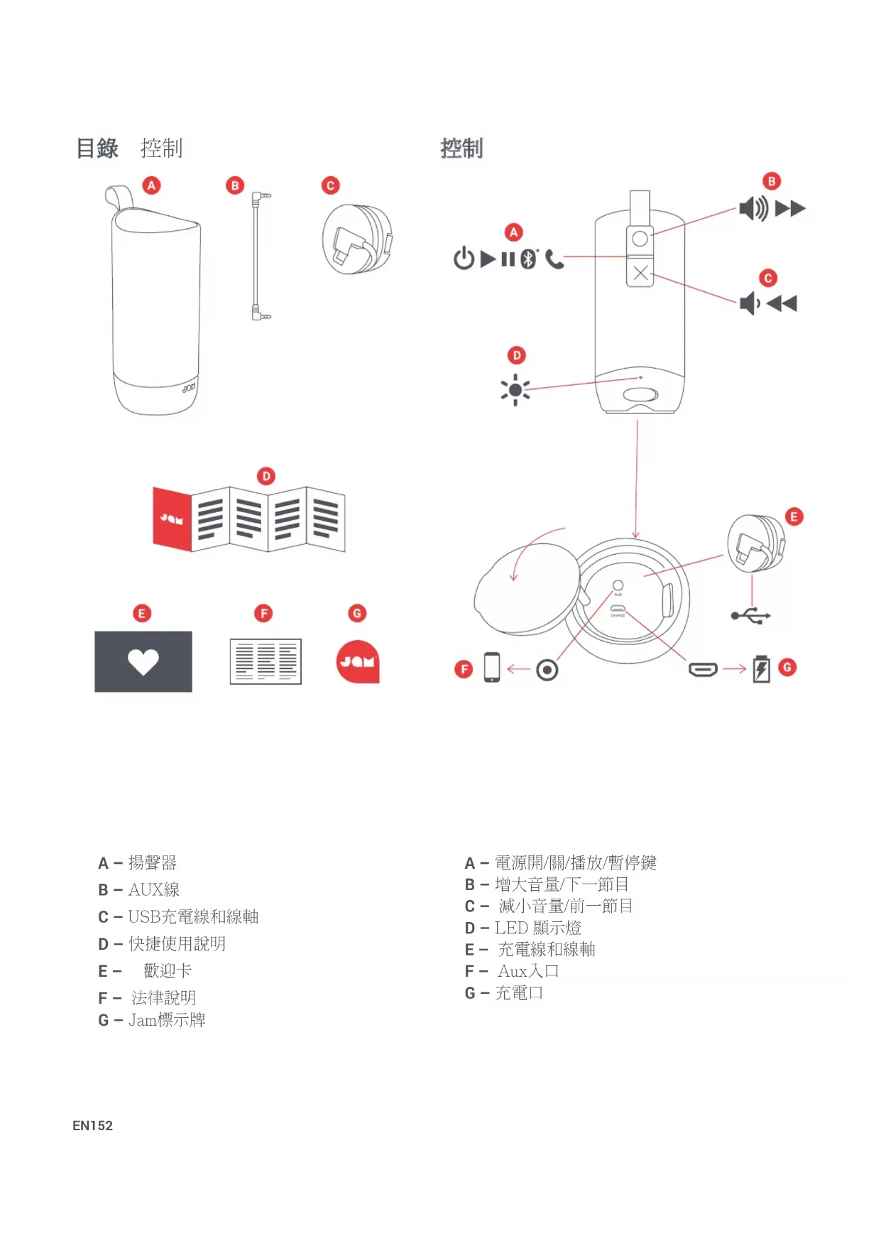 A –揚聲器 B –AUX線 C –USB充電線和線軸 D –快捷使用說明 E – 歡迎卡 F –法律說明 G –Jam標示牌 A –電源開/關/播放/暫停鍵 B –增大音量/下一節目 C –減小音量/前一節目 D –LED顯示燈 E –充電線和線軸 F –Aux入口 G –充電口EN 153 CHARGE AUX CHARGE