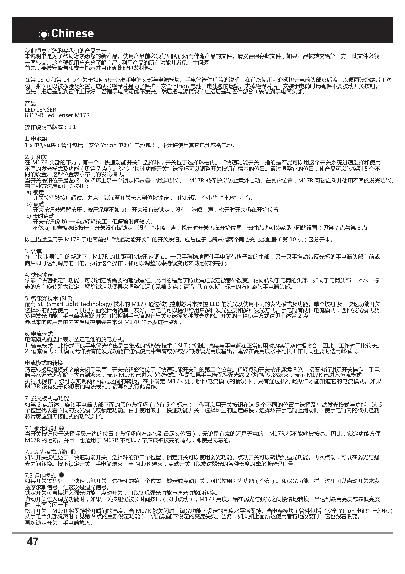 出于安全和审批(CE)的目的,禁止改装及/或改变产品。产品只能作为手电筒使用。如果M17R手电筒被用于任何其它的目的,或使用不当,它可能被损坏及无害化利用不再被保证(火警、短路、电击等)。对人身伤害或财产损坏将没有任何责任,并且制造商的保修将变无效。