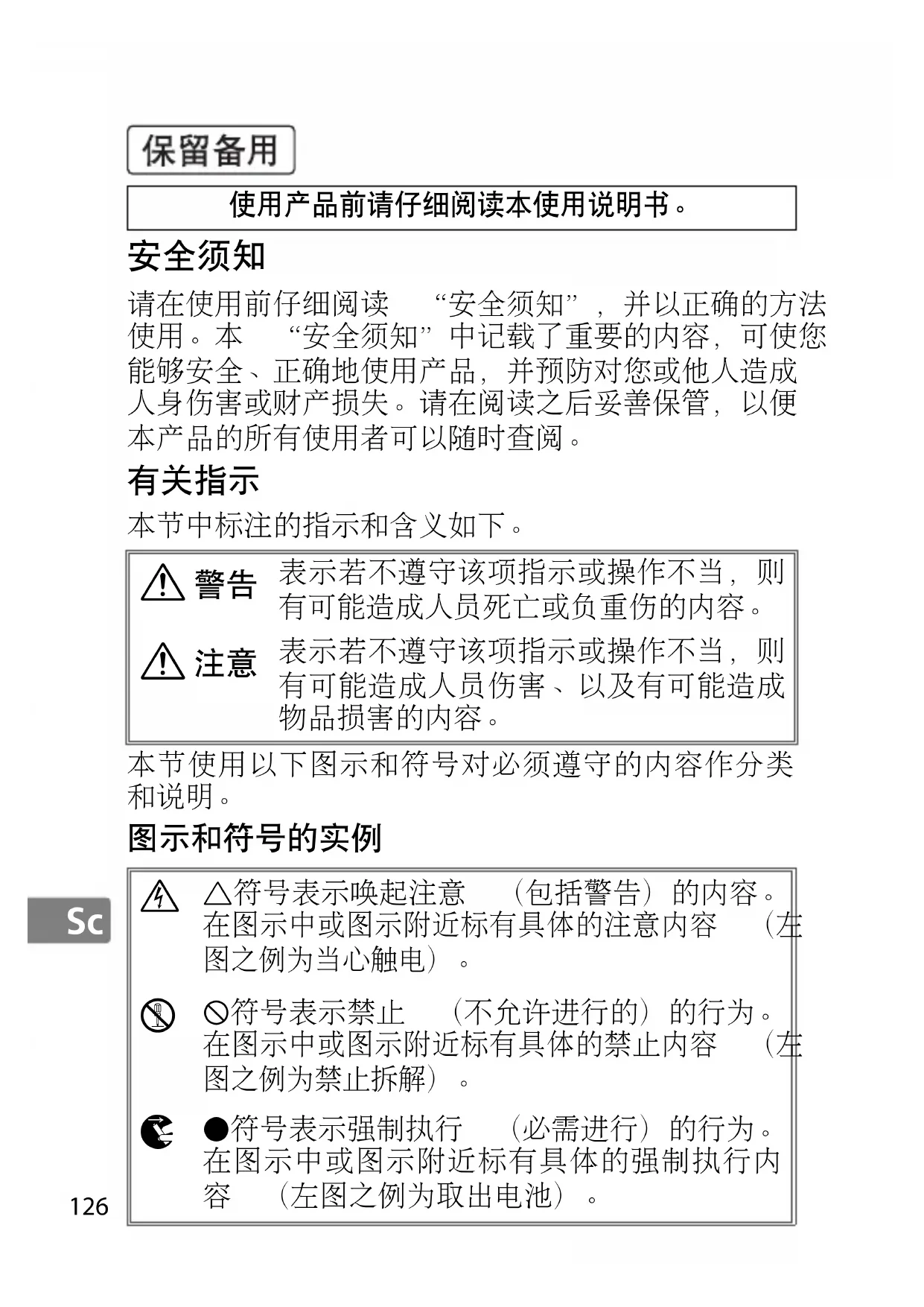 表示若不遵守该项指示或操作不当,则有可能造成人员伤害、以及有可能造成物品损害的内容。 L符号表示唤起注意 (包括警告)的内容。在图示中或图示附近标有具体的注意内容 (左图之例为当心触电)。 F符号表示禁止 (不允许进行的)的行为。在图示中或图示附近标有具体的禁止内容 (左图之例为禁止拆解)。 D符号表示强制执行 (必需进行)的行为。在图示中或图示附近标有具体的强制执行内容 (左图之例为取出电池)。127