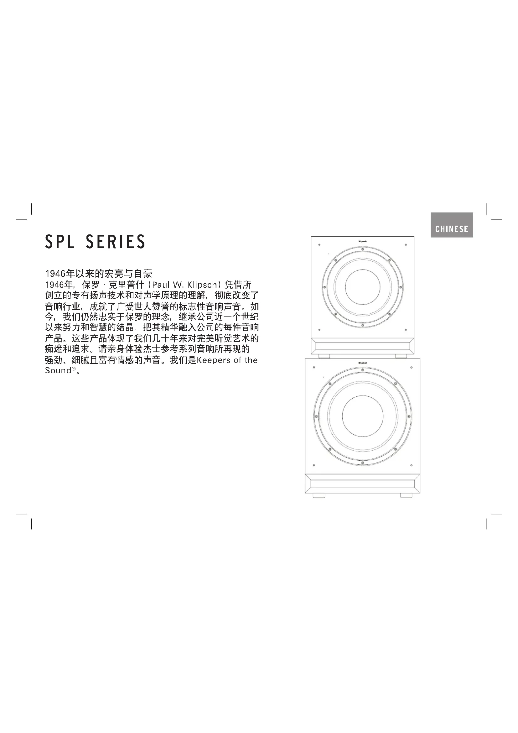 1946年以来的宏亮与自豪 1946年,保罗·克里普什 (Paul W. Klipsch) 凭借所 创立的专有扬声技术和对声学原理的理解,彻底改变了 音响行业,成就了广受世人赞誉的标志性音响声音。如 今,我们仍然忠实于保罗的理念,继承公司近一个世纪 以来努力和智慧的结晶,把其精华融入公司的每件音响 产品。这些产品体现了我们几十年来对完美听觉艺术的 痴迷和追求。请亲身体验杰士参考系列音响所再现的 强劲、细腻且富有情感的声音。我们是Keepers of the Sound