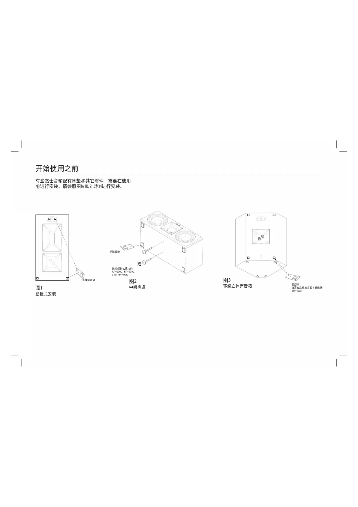 RP-8060FA RP-600M RP-504C RP-404C RP-600C RP-500C RP-400C RP-500M RP-400M RP-502S RP-402S RP-500SA RP-8000F RP-6000F RP-5000F RP-4000F开始使用之前 有些杰士音箱配有脚垫和其它附件,需要在使用 前进行安装。请参照图1A 1B, 2, 3和4进行安装。