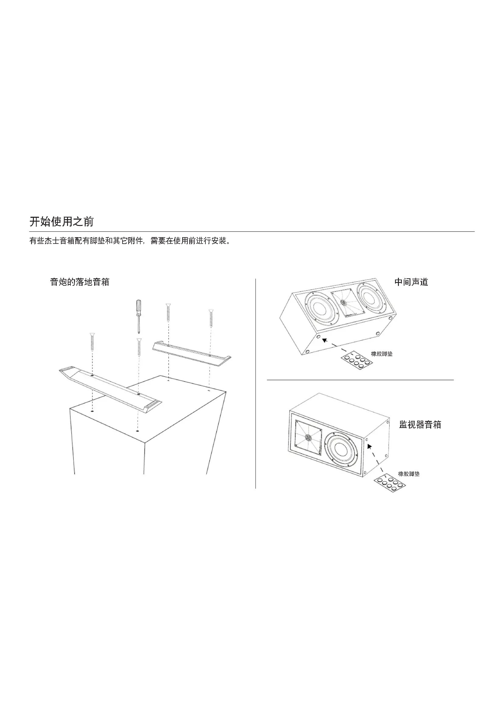 有些杰士音箱配有脚垫和其它附件,需要在使用前进行安装。 音炮的落地音箱室内音箱的布放 电气连接 左、右主声道音箱:为了获得最佳效果,杰士集团有限公司 ( KGI) 建议您把音箱分开6到15英尺( 1.8- 4.6米)放置。另外, 音箱与后墙和侧墙的距离要保持至少24英寸( 61厘米)。两个 音箱可稍微内倾,这样可以更好地再现立体声效果。收听者与音 箱的距离应该是两扬声器间距的约1至1.5倍。请参见图1和图3进