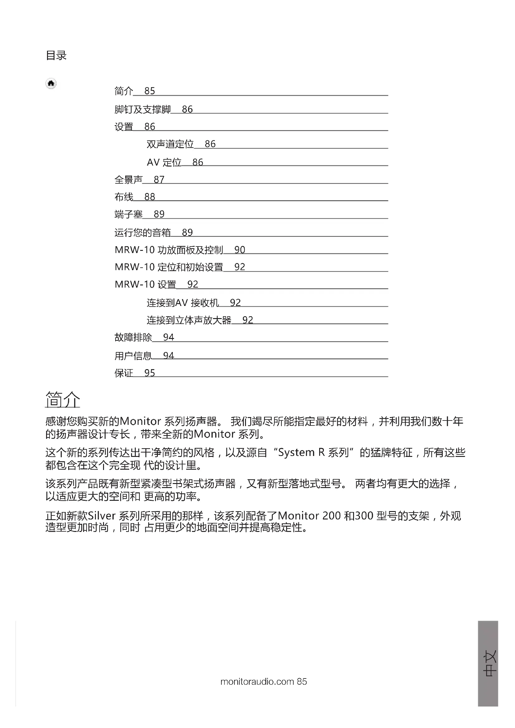 感谢您购买新的Monitor 系列扬声器。 我们竭尽所能指定最好的材料,并利用我们数十年 的扬声器设计专长,带来全新的Monitor 系列。 这个新的系列传达出干净简约的风格,以及源自“System R 系列”的猛牌特征,所有这些 都包含在这个完全现 代的设计里。 该系列产品既有新型紧凑型书架式扬声器,又有新型落地式型号。 两者均有更大的选择, 以适应更大的空间和 更高的功率。 正如新款Silver 系列所采用的那样,该系列配备了Monitor 200 和300 型号的支架,外观 造型更加时尚,同时 占用更少的地面空间并提高稳定性。 简介 85 脚钉及支撑脚 86 设置 86 双声道定位 86 AV 定位 86 全景声 87 布线 88 端子塞 89 运行您的音箱 89 MRW-10 功放面板及控制 90 MRW-10 定位和初始设置 92 MRW-10 设置 92 连接到AV 接收机 92 连接到立体声放大器 92 故障排除 94 用户信息 94 保证 95Monitor Series86