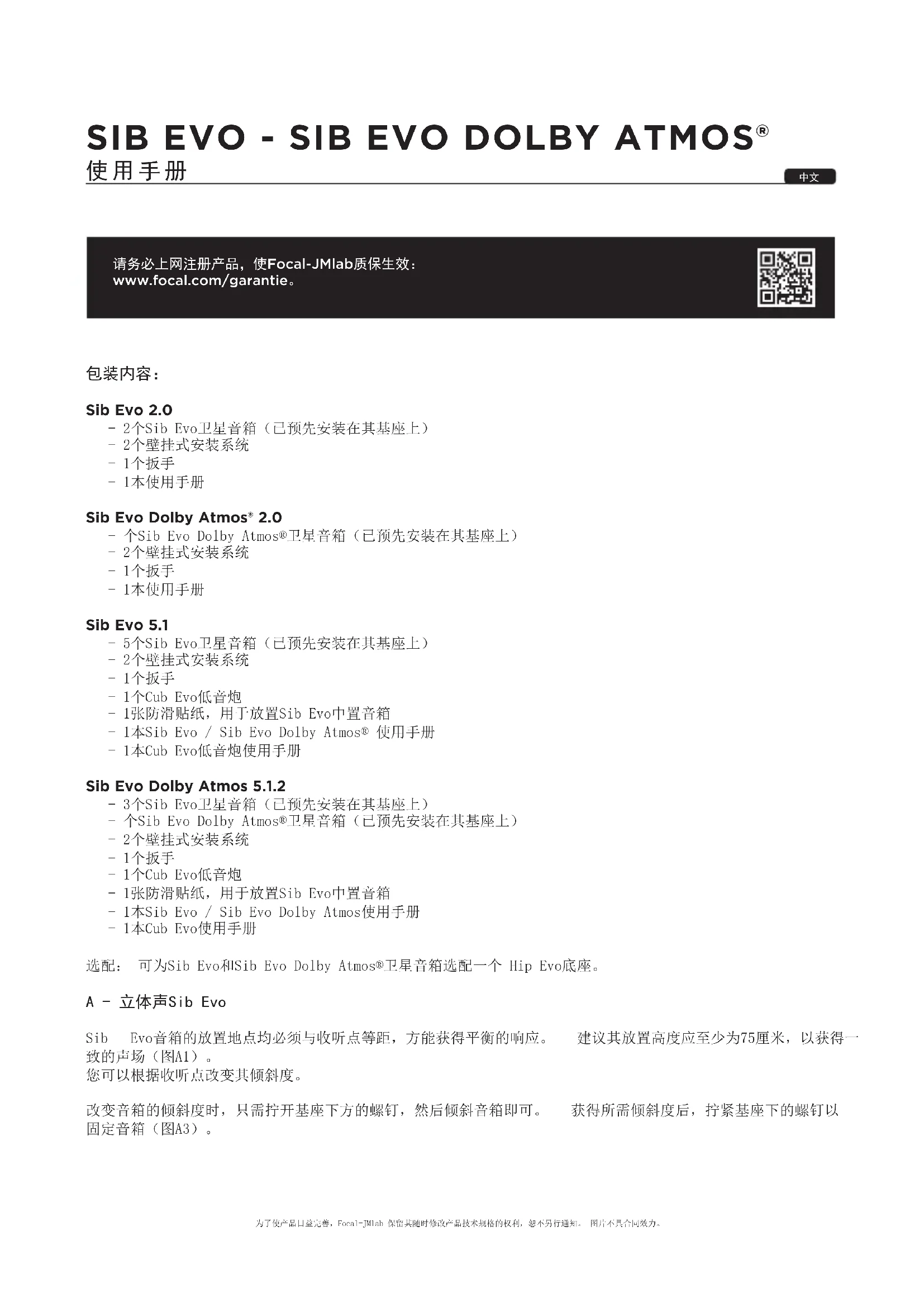 Sib Evo 2.0 -2个SibEvo卫星音箱(已预先安装在其基座上) -2个壁挂式安装系统 -1个扳手 -1本使用手册 Sib Evo Dolby Atmos® 2.0 -个SibEvoDolbyAtmos®卫星音箱(已预先安装在其基座上) -2个壁挂式安装系统 -1个扳手 -1本使用手册 Sib Evo 5.1 -5个SibEvo卫星音箱(已预先安装在其基座上) -2个壁挂式安装系统 -1个扳手 -1个CubEvo低音炮 -1张防滑贴纸,用于放置SibEvo中置音箱 -1本SibEvo/SibEvoDolbyAtmos®使用手册 -1本CubEvo低音炮使用手册 Sib Evo Dolby Atmos 5.1.2 -3个SibEvo卫星音箱(已预先安装在其基座上) -个SibEvoDolbyAtmos®卫星音箱(已预先安装在其基座上) -2个壁挂式安装系统 -1个扳手 -1个CubEvo低音炮 -1张防滑贴纸,用于放置SibEvo中置音箱 -1本SibEvo/SibEvoDolbyAtmos使用手册 -1本CubEvo使用手册 选配:可为SibEvo和SibEvoDolbyAtmos®卫星音箱选配一个HipEvo底座。 A - 立体声Sib Evo Sib Evo音箱的放置地点均必须与收听点等距,方能获得平衡的响应。 建议其放置高度应至少为75厘米,以获得一 致的声场(图A1)。 您可以根据收听点改变其倾斜度。 改变音箱的倾斜度时,只需拧开基座下方的螺钉,然后倾斜音箱即可。 获得所需倾斜度后,拧紧基座下的螺钉以 固定音箱(图A3)。 为了使产品日益完善,Focal-JMlab保留其随时修改产品技术规格的权利,恕不另行通知。图片不具合同效力。Notice_SibEvo_SibEvo DolbyAtmos.indd 40 21/02/17 12:0641 SIB EVO - SIB EVO DOLBY ATMOS®