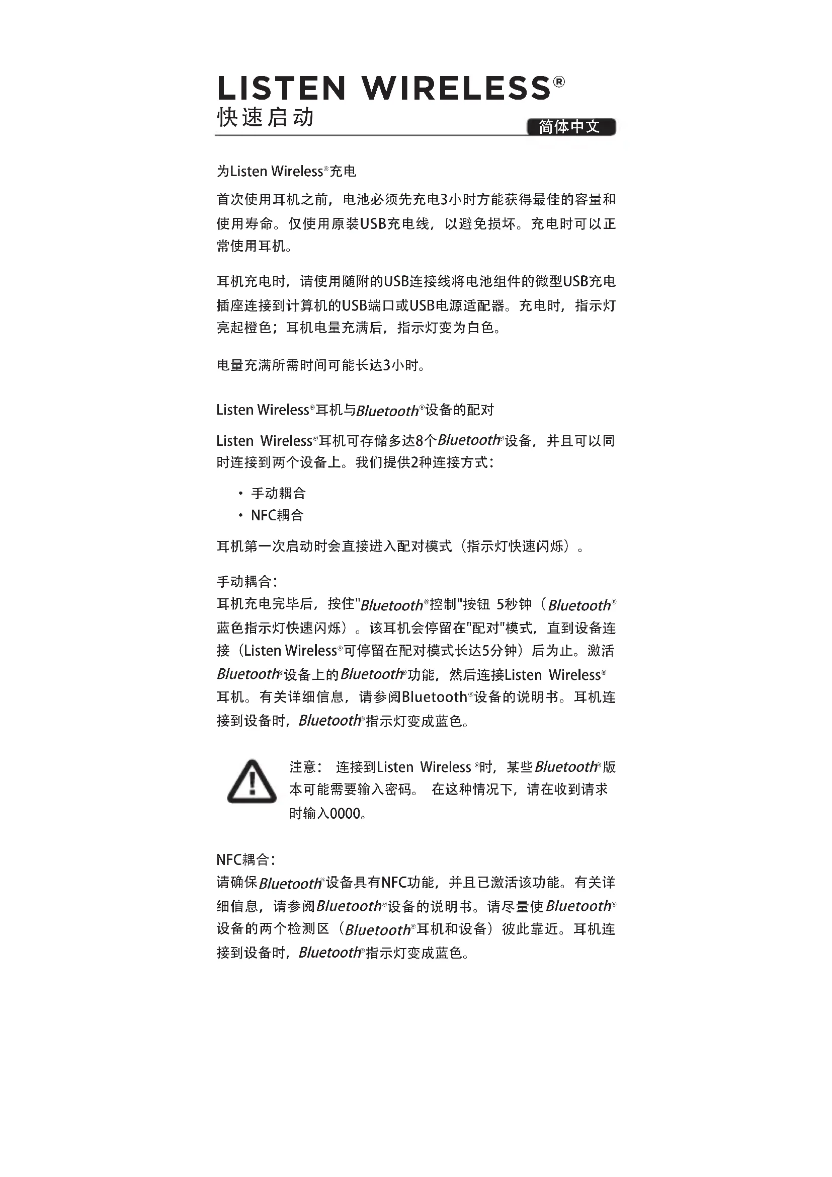 蓝色指示灯快速闪烁)。该耳机会停留在"配对"模式,直到设备连 接(Listen Wireless®可停留在配对模式长达5分钟)后为止。激活 Bluetooth