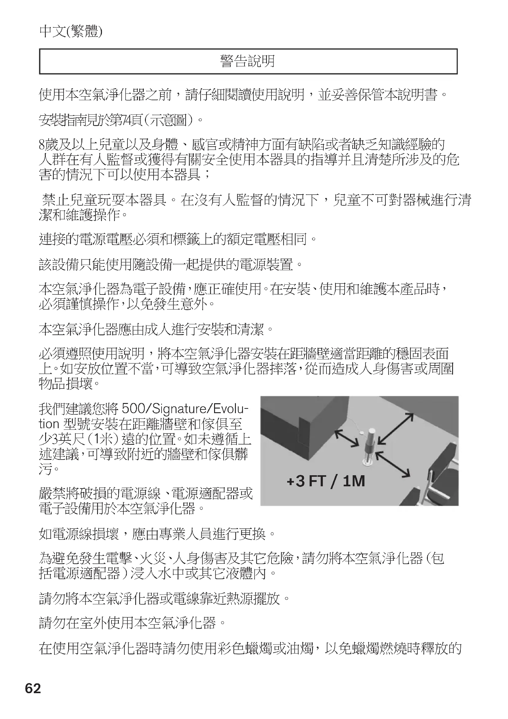 使用本空氣淨化器之前,請仔細閱讀使用說明,並妥善保管本說明書。 安 裝 指 南 見 於 第 7 4 頁( 示 意 圖 )。 8歲及以上兒童以及身體、感官或精神方面有缺陷或者缺乏知識經驗的 人群在有人監督或獲得有關安全使用本器具的指導并且清楚所涉及的危 害的情況下可以使用本器具; 禁止兒童玩耍本器具。在沒有人監督的情況下,兒童不可對器械進行清 潔 和 維 護 操 作。 連接的電源電壓必須和標籤上的額定電壓相同。 該設備只能使用隨設備一起提供的電源裝置。 本 空 氣 淨 化 器 為 電 子 設 備,應 正 確 使 用。在 安 裝、使 用 和 維 護 本 產 品 時, 必 須 謹 慎 操 作,以 免 發 生 意 外。 本空氣淨化器應由成人進行安裝和清潔。 必須遵照使用說明,將本空氣淨化器安裝在距牆壁適當距離的穩固表面 上。如安放位置不當,可導致空氣淨化器摔落,從而造成人身傷害或周圍