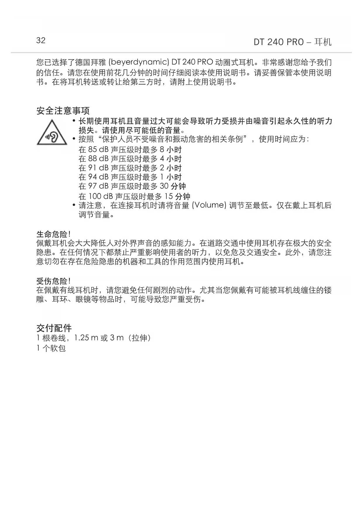 您已选择了德国拜雅 (beyerdynamic) DT 240 PRO 动圈式耳机。非常感谢您给予我们 的信任。请您在使用前花几分钟的时间仔细阅读本使用说明书。请妥善保管本使用说明 书。在将耳机转送或转让给第三方时,请附上使用说明书。