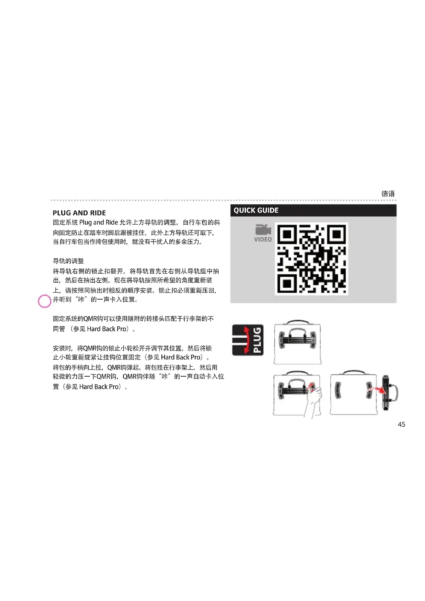 固定系统 Plug and Ride 允许上方导轨的调整。自行车包的斜向固定防止在踏车时脚后跟被挂住。此外上方导轨还可取下,当自行车包当作挎包使用时,就没有干扰人的多余压力。