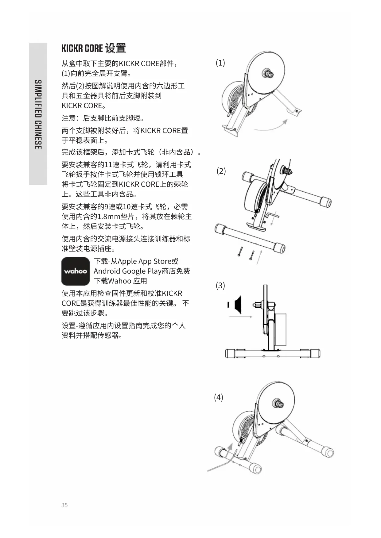 SIMPLIFIED CHINESE (1) (2) (3) (4)36 专业意见-下压鞍座时抬前轮,以此确保自行车完全安装在训练器材上。 连接您的自行车(安装到自行车上) 将自行车链变换为前后最小链轮,然后取下后轮。通过将车链与KICKR CORE上的