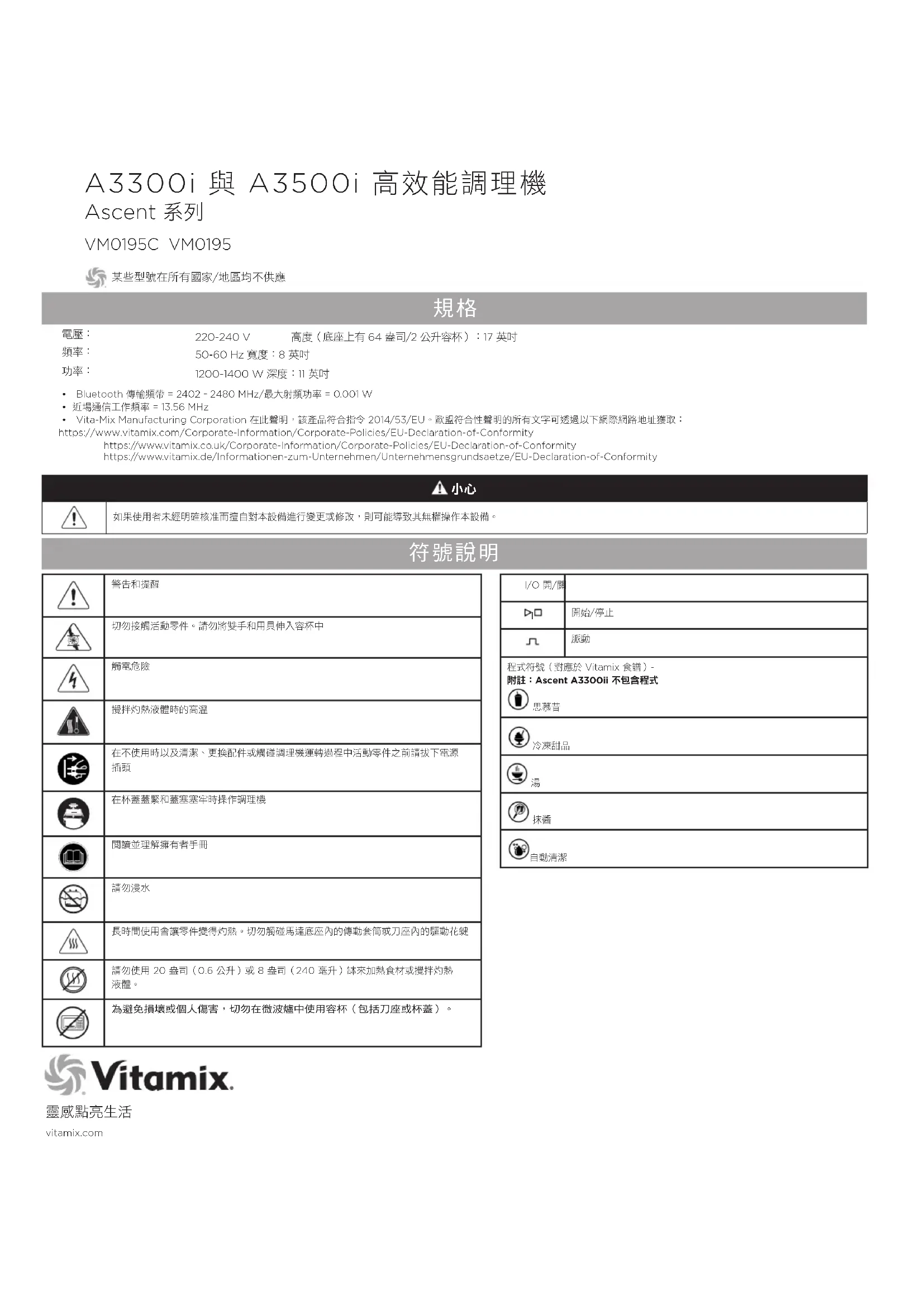 的正常行為,可避免正常使用過程中的危險。計數器僅供使用者參考,不作為調理機運作的必要功能。安全使用重要指示 本品僅供家庭使用,不可用作商業用途。切勿讓 Vitamix 調理機在無人看管的情形下運作。必須由 Vitamix 或 Vitamix 授權服務代表執行任何維修、維護或更換工作。注意:若違反任何重要安全措施和安全使用重要指示,都屬於對 VITAMIX 調理機的誤用,可能會導致您的保固無效以及嚴重人身傷害。
