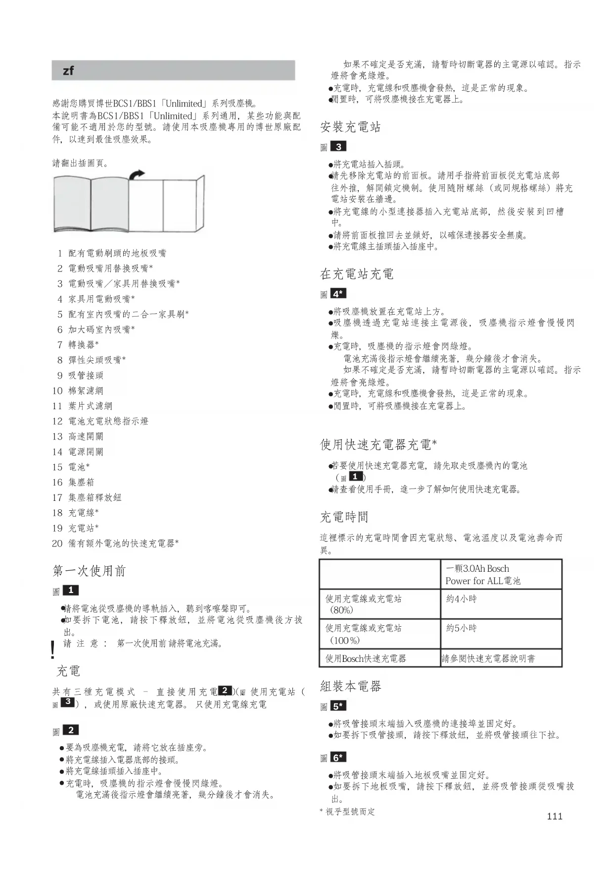*111 感謝您購買博世BCS1/BBS1「Unlimited」系列吸塵機。 本說明書為BCS1/BBS1「Unlimited」系列通用,某些功能與配 備可能不適用於您的型號。請使用本吸塵機專用的博世原廠配 件,以達到最佳吸塵效果。