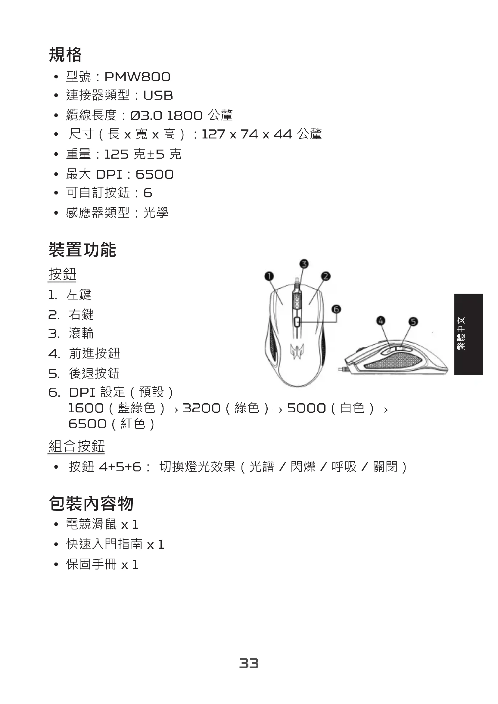 | 技术规格 | 光学鼠标,PMW800传感器,最高8000 DPI分辨率,5档DPI可调 |