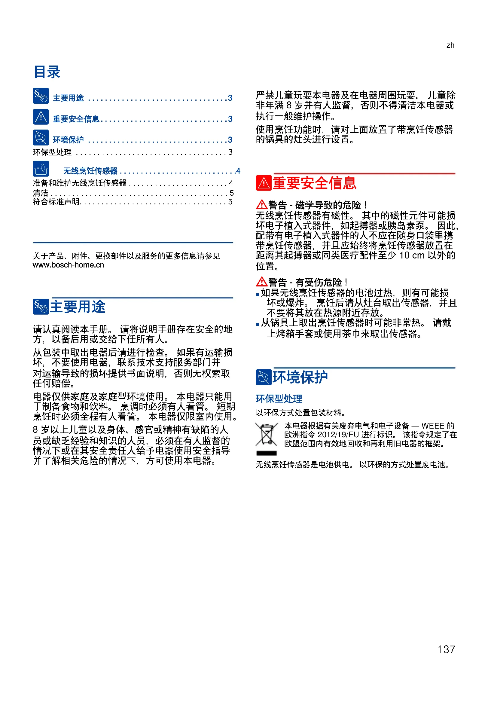 以环保方式处置包装材料。 无线烹饪传感器是电池供电。 以环保的方式处置废电池。 本电器根据有关废弃电气和电子设备 — WEEE 的 欧洲指令 2012/19/EU 进行标识。 该指令规定了在 欧盟范围内有效地回收和再利用旧电器的框架。 137zh 无线烹饪传感器