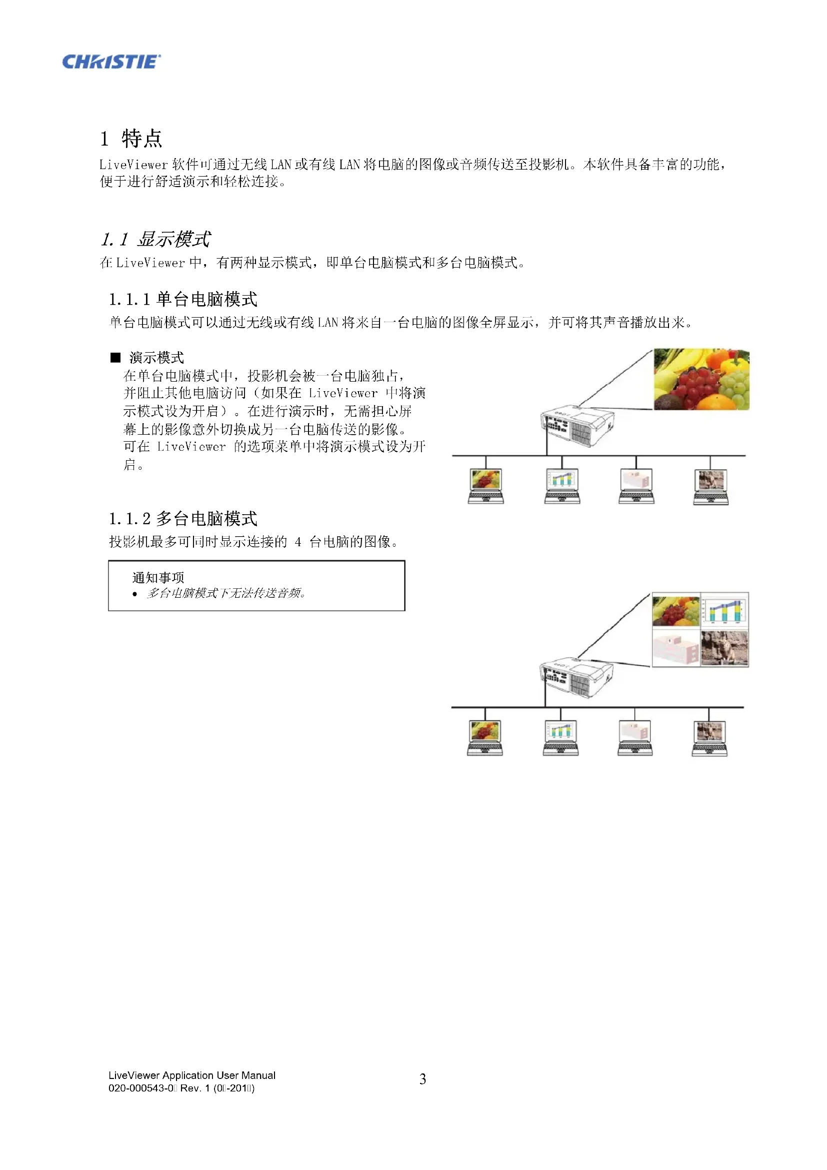 单台电脑模式可以通过无线或有线 LAN 将来自一台电脑的图像全屏显示,并可将其声音播放出来。 ■ 演示模式 在单台电脑模式中,投影机会被一台电脑独占,并阻止其他电脑访问(如果在 LiveViewer 中将演示模式设为开启)。在进行演示时,无需担心屏幕上的影像意外切换成另一台电脑传送的影像。可在 LiveViewer 的选项菜单中将演示模式设为开启。