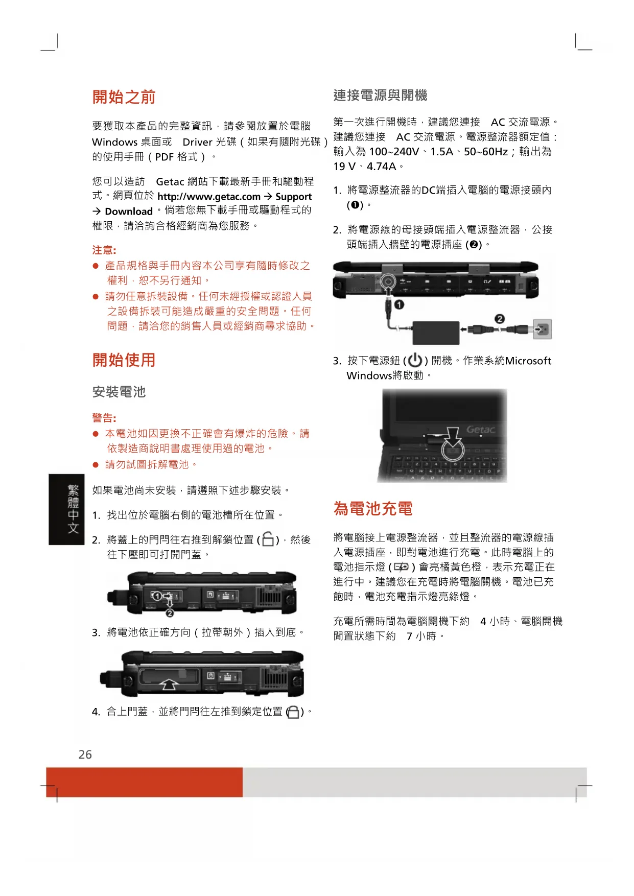 要獲取本產品的完整資訊,請參閱放置於電腦Windows 桌面或 Driver 光碟(如果有隨附光碟)的使用手冊(PDF 格式)。 您可以造訪 Getac 網站下載最新手冊和驅動程式。網頁位於http://www.getac.com Support Download。倘若您無下載手冊或驅動程式的權限,請洽詢合格經銷商為您服務。 注意: 產品規格與手冊內容本公司享有隨時修改之權利,恕不另行通知。 請勿任意拆裝設備。任何未經授權或認證人員之設備拆裝可能造成嚴重的安全問題。任何問題,請洽您的銷售人員或經銷商尋求協助。