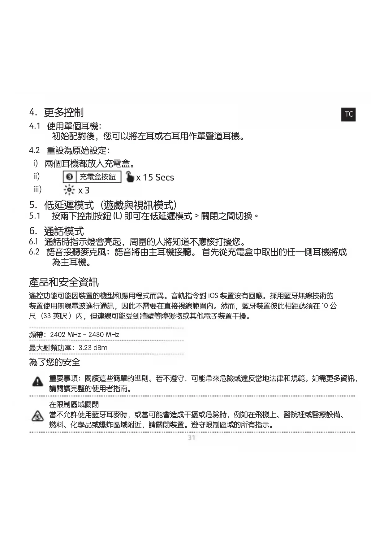4.1 使用单个耳机:初始配对后,您可以将左耳或右耳用作单声道耳机。