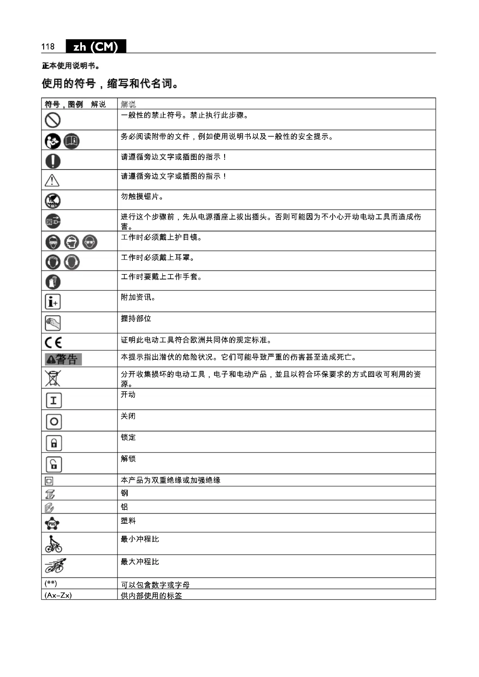 平均鋸削震蕩值m, s, kg, A, mm, V, W, Hz, N, °C, dB, min, m/s 米,秒,公斤,安培,毫米,伏特,瓦,赫茲,牛頓,攝氏,分貝,分,米/秒 國際性單位系統 SI 中的標準單位和引用單位。 OBJ_BUCH-0000000078-004.book Page 123 Wednesday, February 26, 2020 1:28 PM124 zh (CK) 此震動水平只適用於電動工具規定的用途。如果未按照 規定使用電動工具,在機器上安裝了不合適的工具,或 者未確實執行機器的維修工作,實際的震動水平會異于 提供的震動水平。因此在操作過程結束后,機器的震動