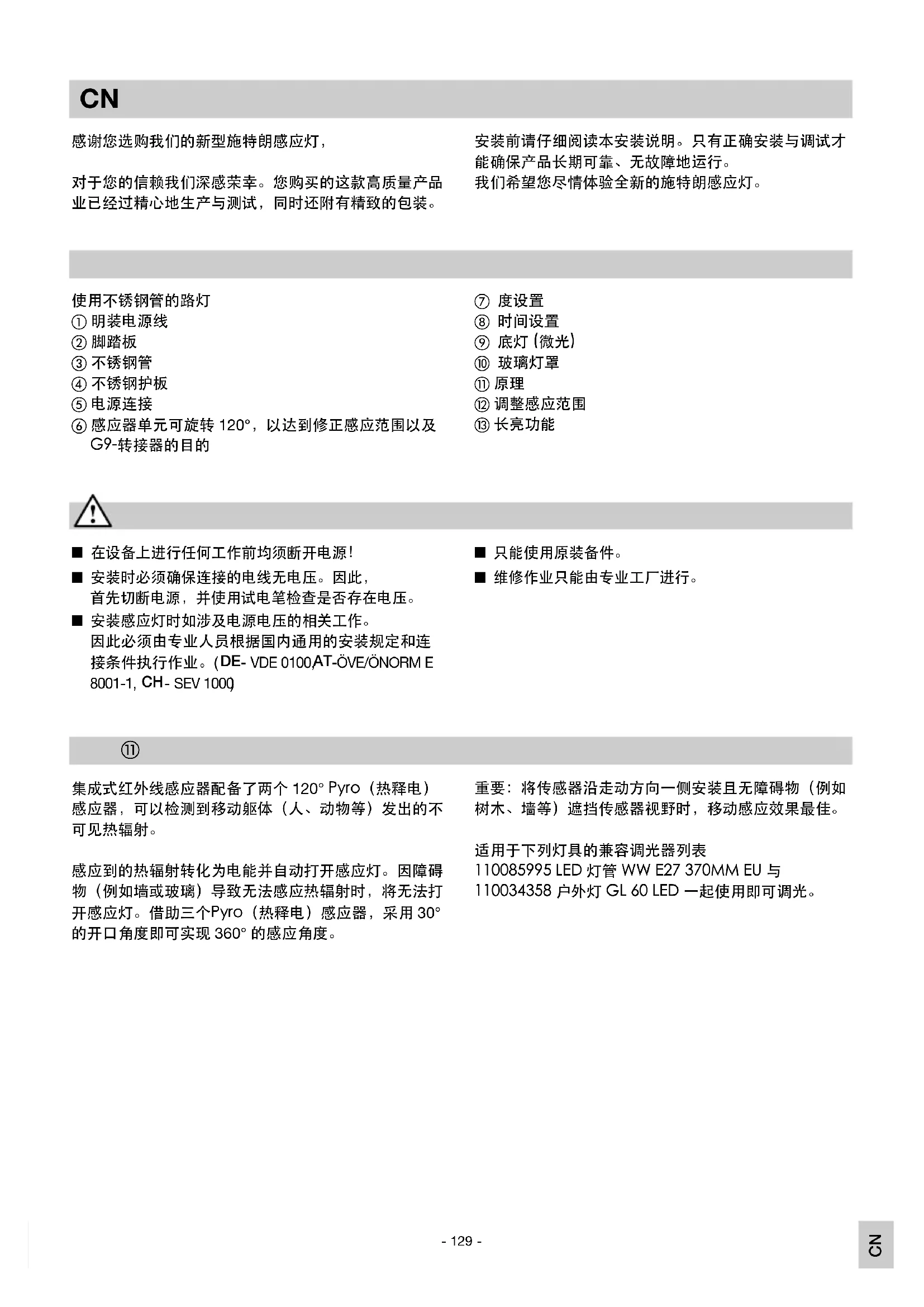 安装前请仔细阅读本安装说明。只有正确安装与调试才 能确保产品长期可靠、无故障地运行。 我们希望您尽情体验全新的施特朗感应灯。 n 只能使用原装备件。 n 维修作业只能由专业工厂进行。