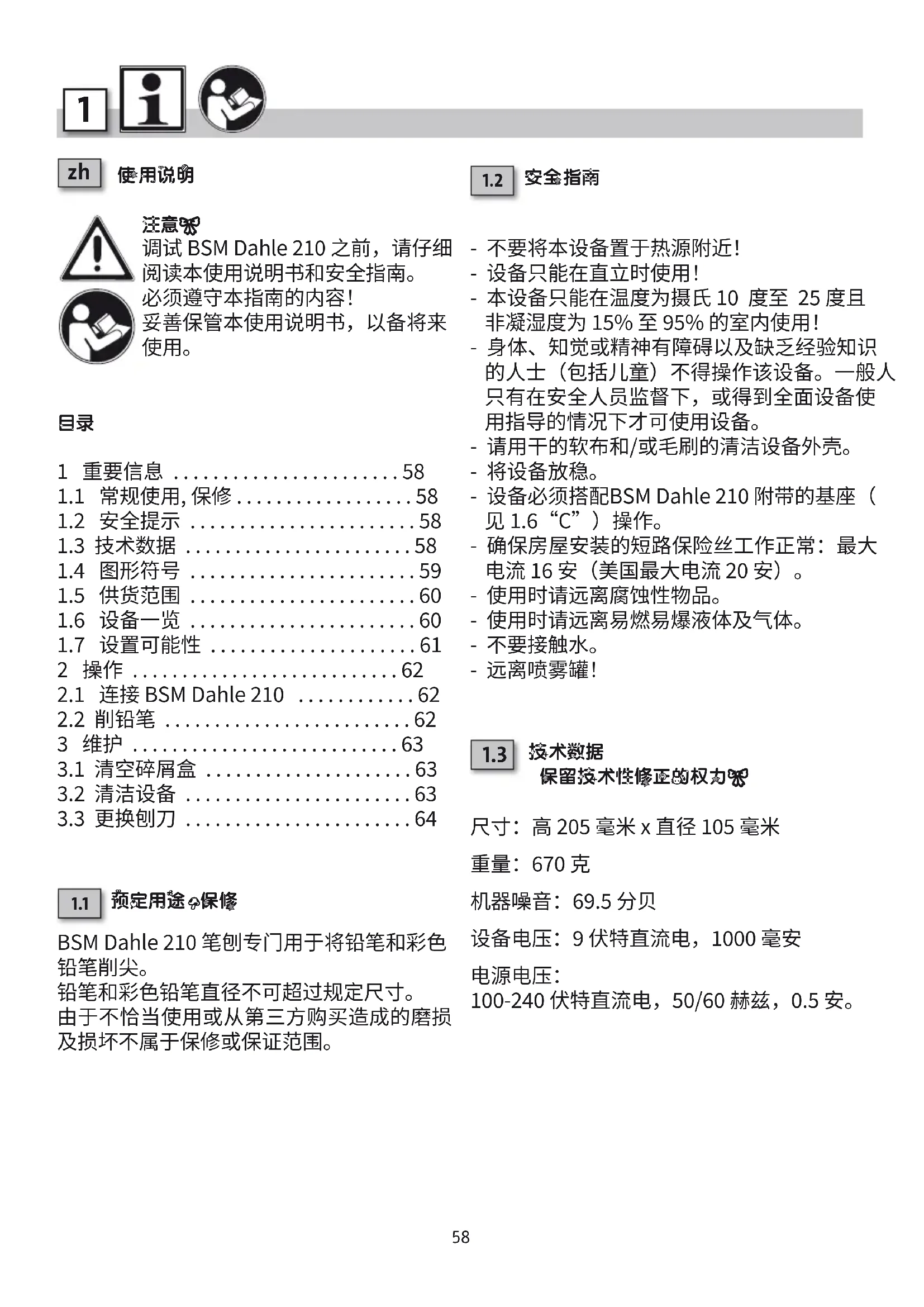 1 重要信息 58 11 常规使用, 保修 58 12 安全提示 58 13 技术数据 58 14 图形符号 59 15 供货范围 60 16 设备一览 60 17 设置可能性 61 2 操作 62 21 连接 BSM Dahle 210 62 22 削铅笔 62 3 维护 63 31 清空碎屑盒 63 32 清洁设备 63 33 更换刨刀 64