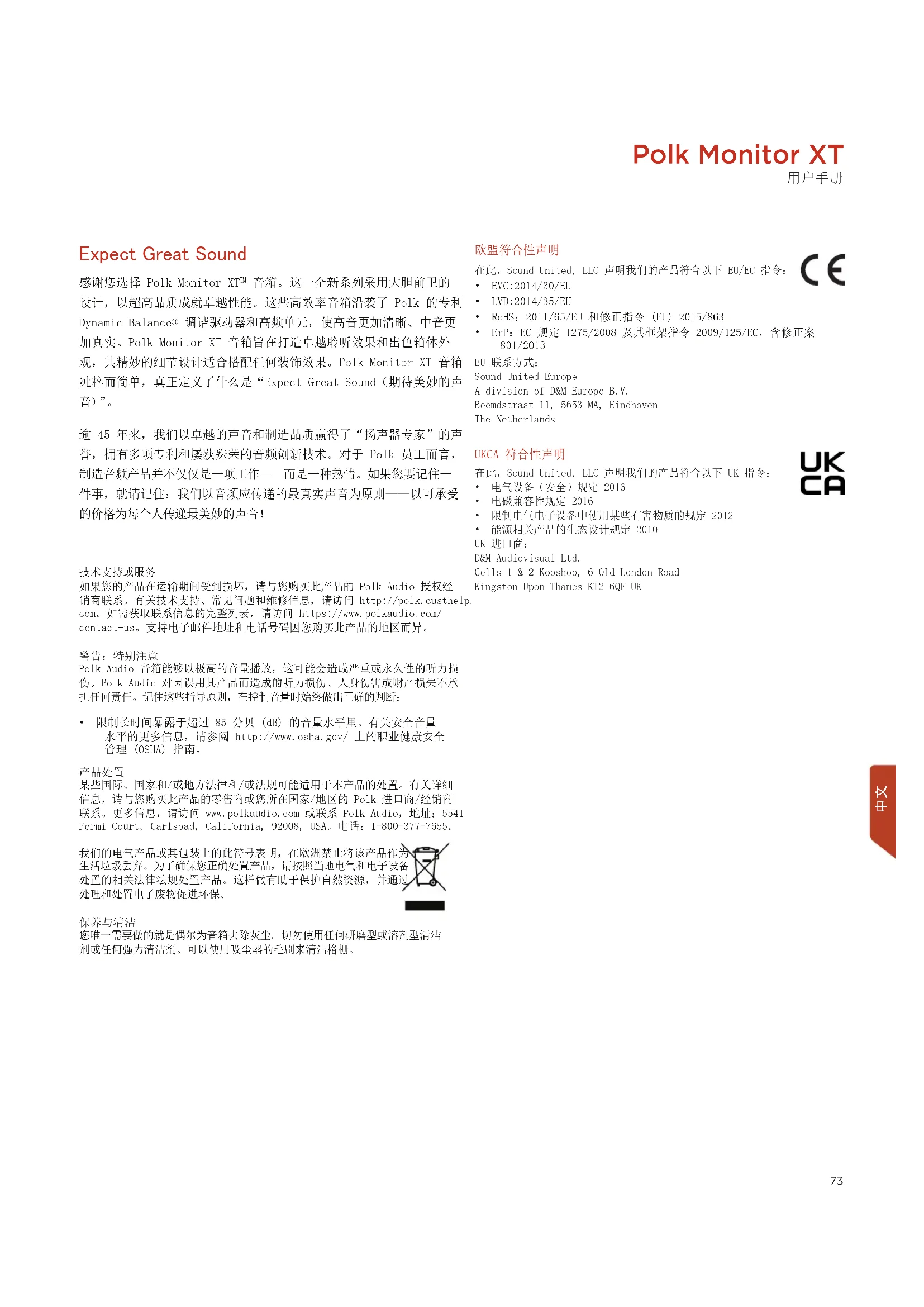 某些国际、国家和/或地方法律和/或法规可能适用于本产品的处置。有关详细 信息,请与您购买此产品的零售商或您所在国家/地区的 Polk 进口商/经销商 联系。更多信息,请访问 www.polkaudio.com 或联系 Polk Audio,地址:5541 Fermi Court, Carlsbad, California, 92008, USA。电话:1-800-377-7655。 我们的电气产品或其包装上的此符号表明,在欧洲禁止将该产品作为 生活垃圾丢弃。为了确保您正确处置产品,请按照当地电气和电子设备 处置的相关法律法规处置产品。这样做有助于保护自然资源,并通过 处理和处置电子废物促进环保。