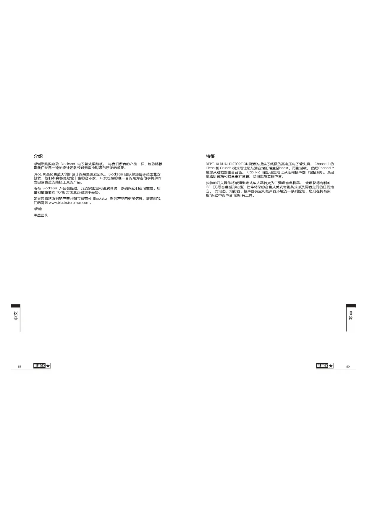 感谢您购买这款 Blackstar 电子管效果踏板。 与我们所有的产品一样,这款踏板 是我们世界一流的设计团队经过无数小时艰苦研发的成果。 Dept. 10是负责蓝天创新设计的黑星研发团队。 Blackstar 团队总部位于英国北安 普敦,他们本身都是经验丰富的音乐家,开发过程的唯一目的是为吉他手提供作 为自我表达的终极工具的产品。 所有 Blackstar 产品都经过广泛的实验室和路演测试,以确保它们在可靠性、质 量和最重要的 TONE 方面真正做到不妥协。 如果您喜欢听到的声音并想了解有关 Blackstar 系列产品的更多信息,请访问我 们的网站 www.blackstaramps.com。